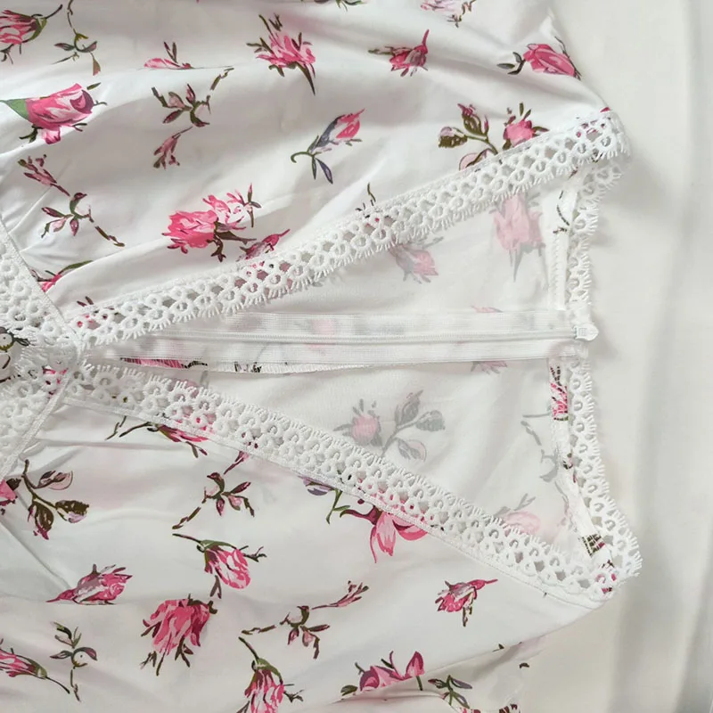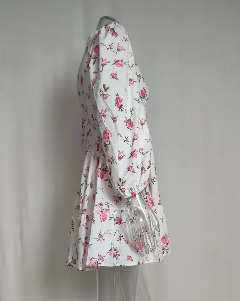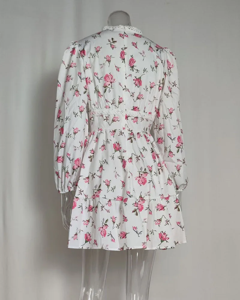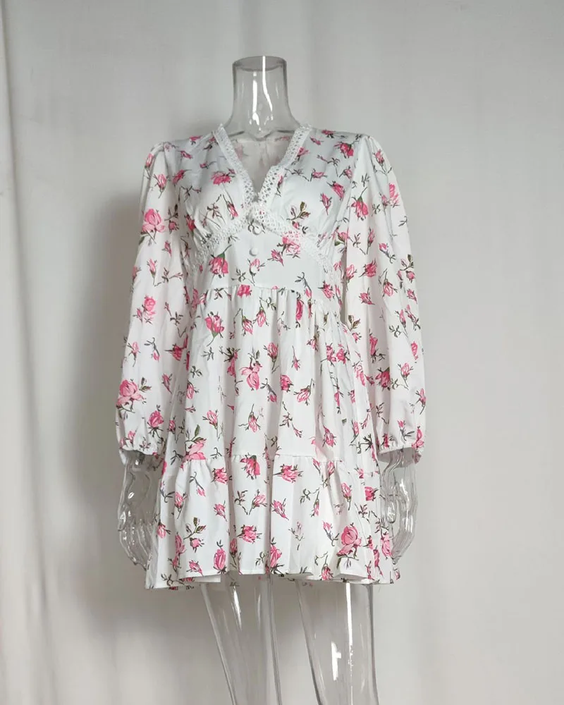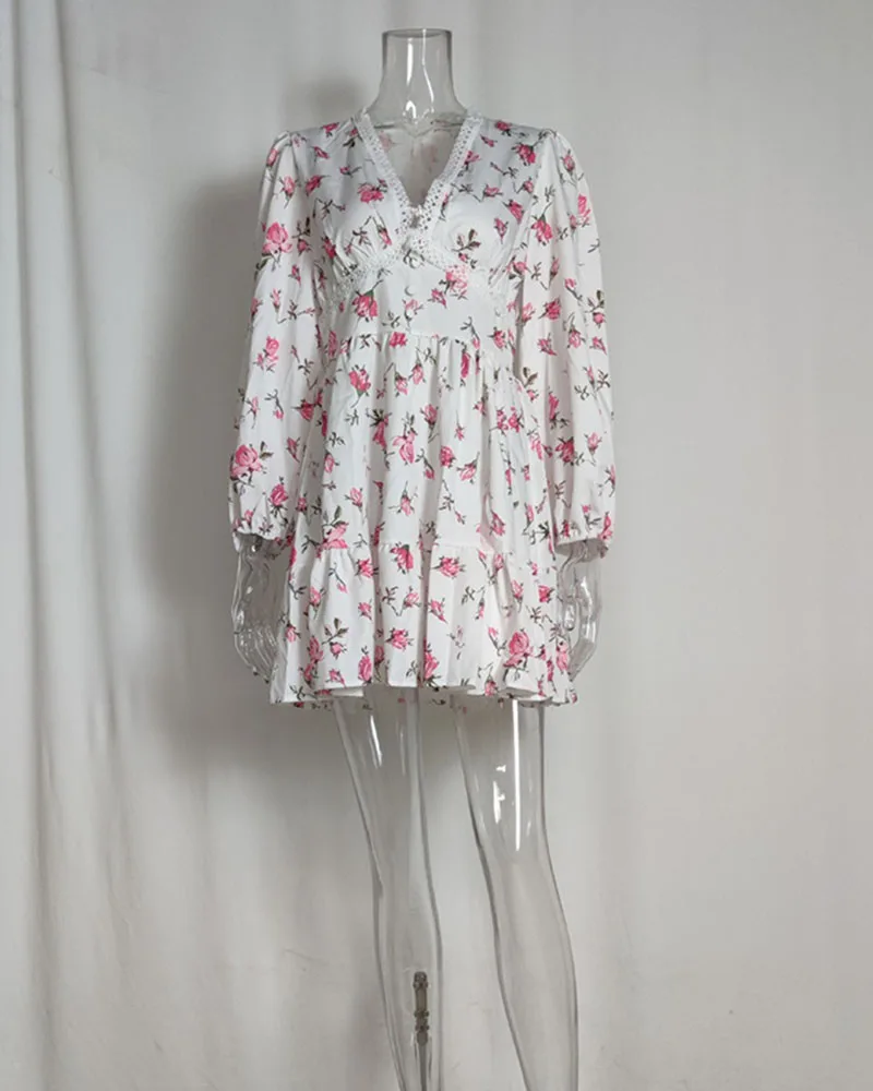 Luxury new elegant sweet print V-neck lace short long sleeve floral dress women