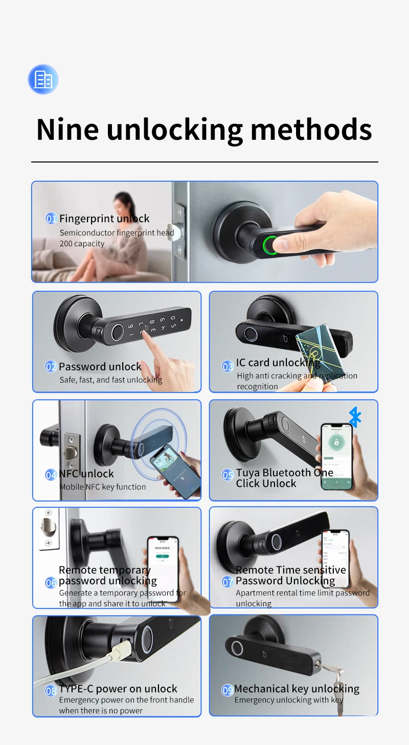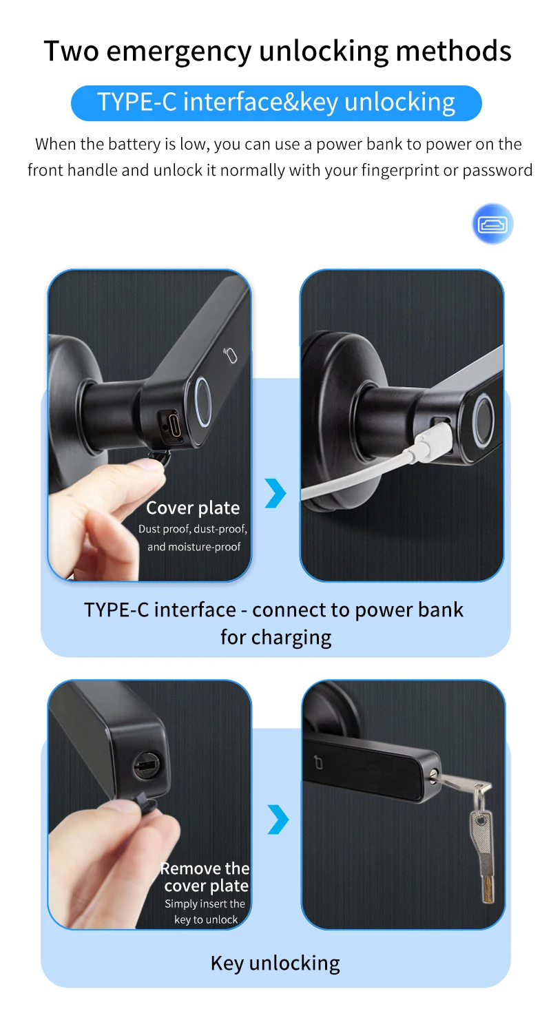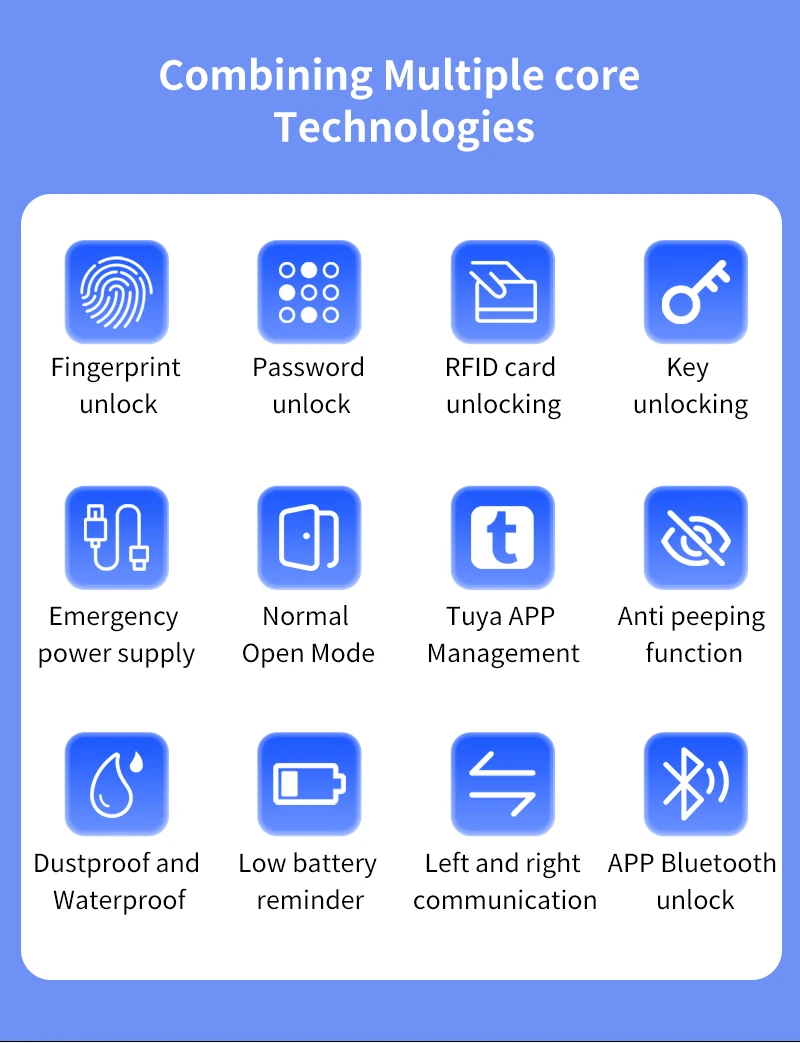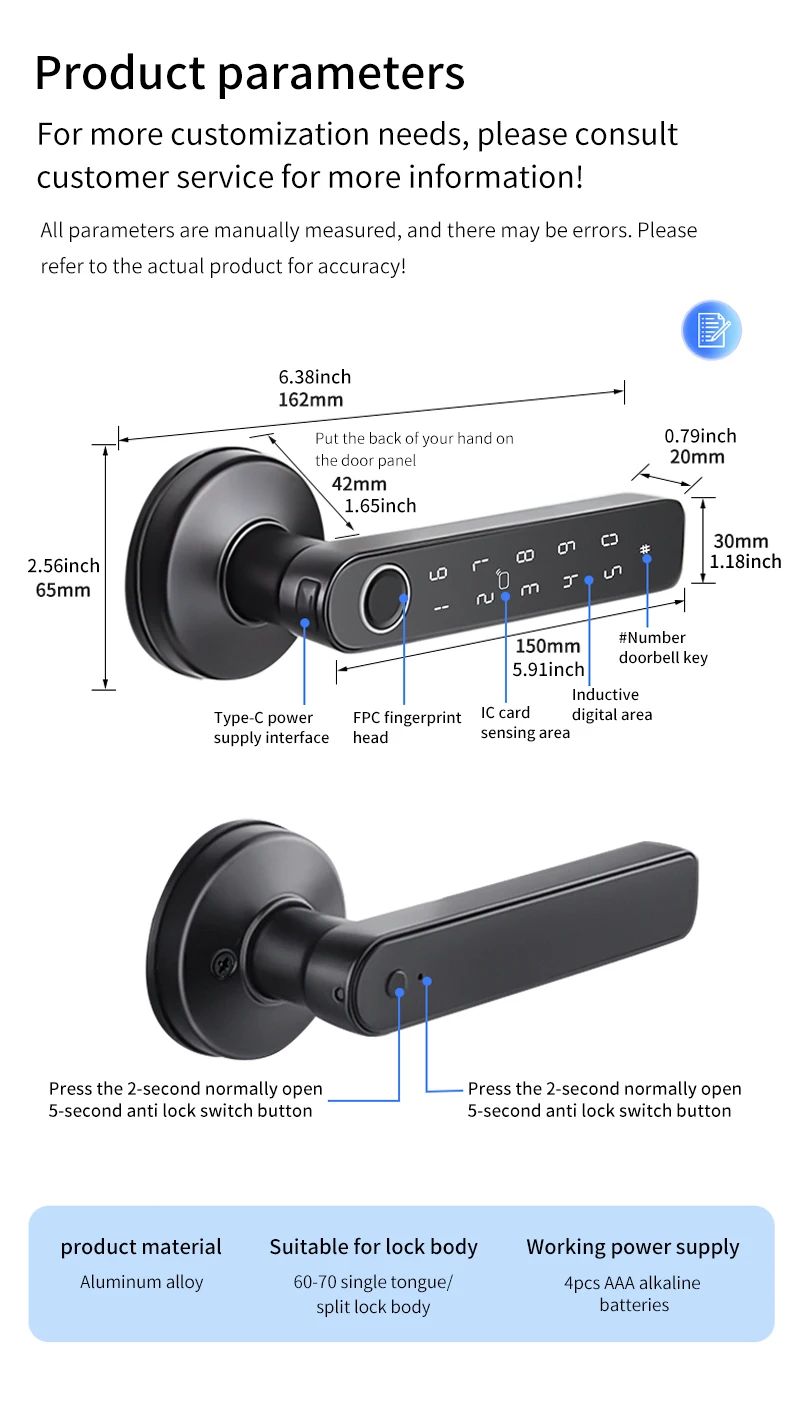 Lock Unlock mode:APP BLE, passwords, fingerprints, mechanical keys,IC Card(Optional)/Gateway Remote Unlock(Optional)