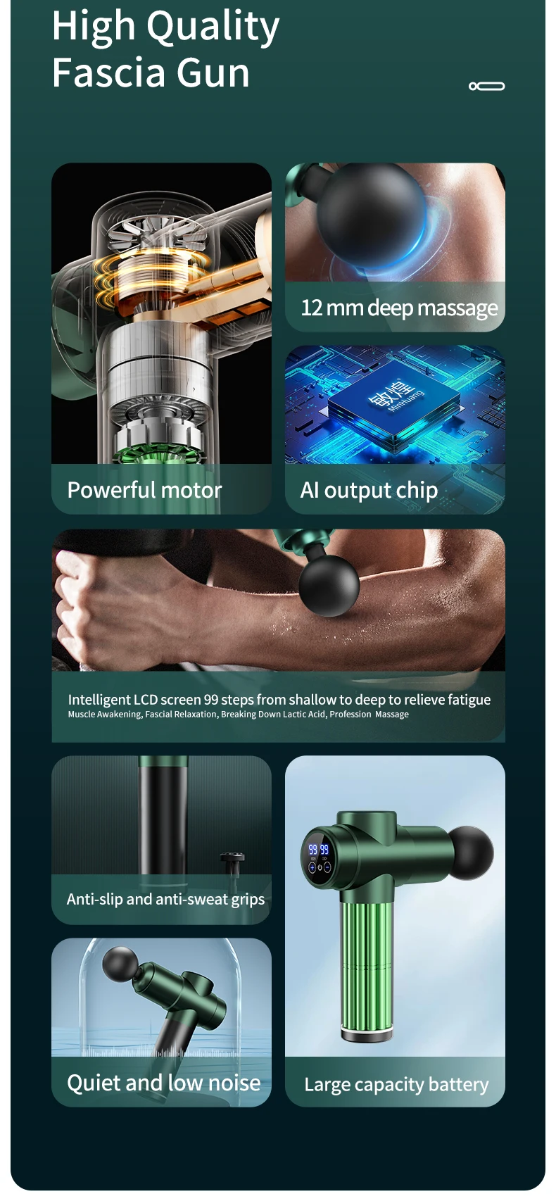 99 strengths: The percussion massage gun is designed with 10 different strengths, covering a wider range of muscle soreness problems that may occur in daily life. Muscle massage gun adopts an ergonomic design that reduces stress on your wrists, hands and arms, and works on deep tissue