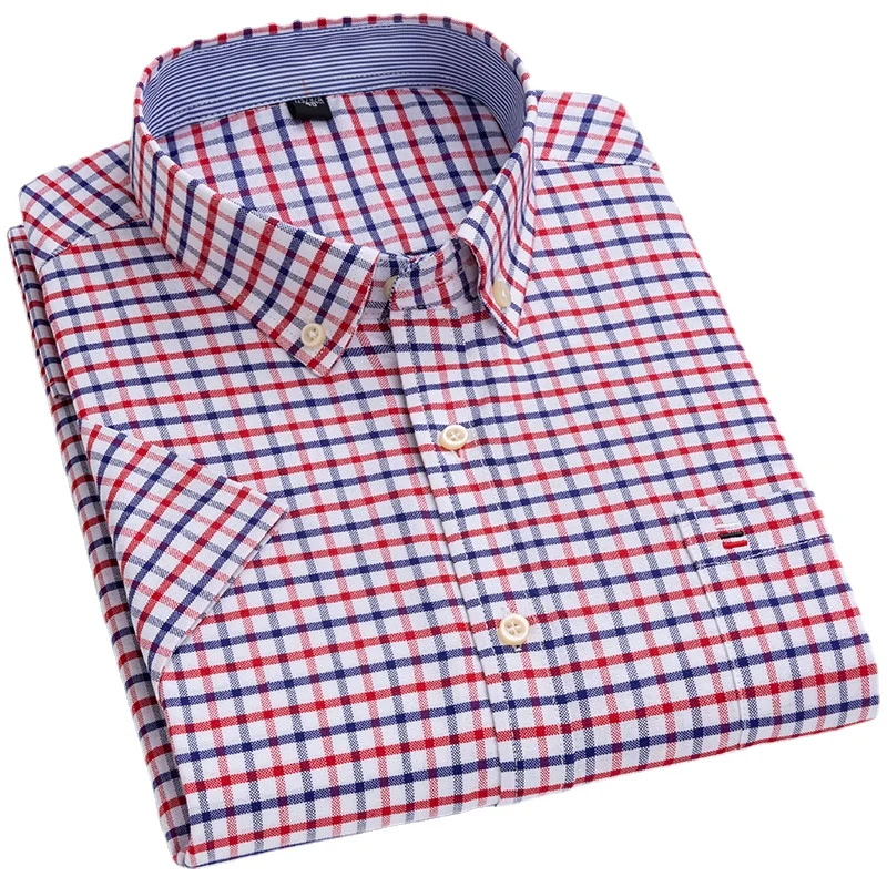 Men’s Oxford Short Sleeve Summer Casual Shirts Single Pocket Comfortable Standard-fit Button-down Plaid Striped Cotton Shirt