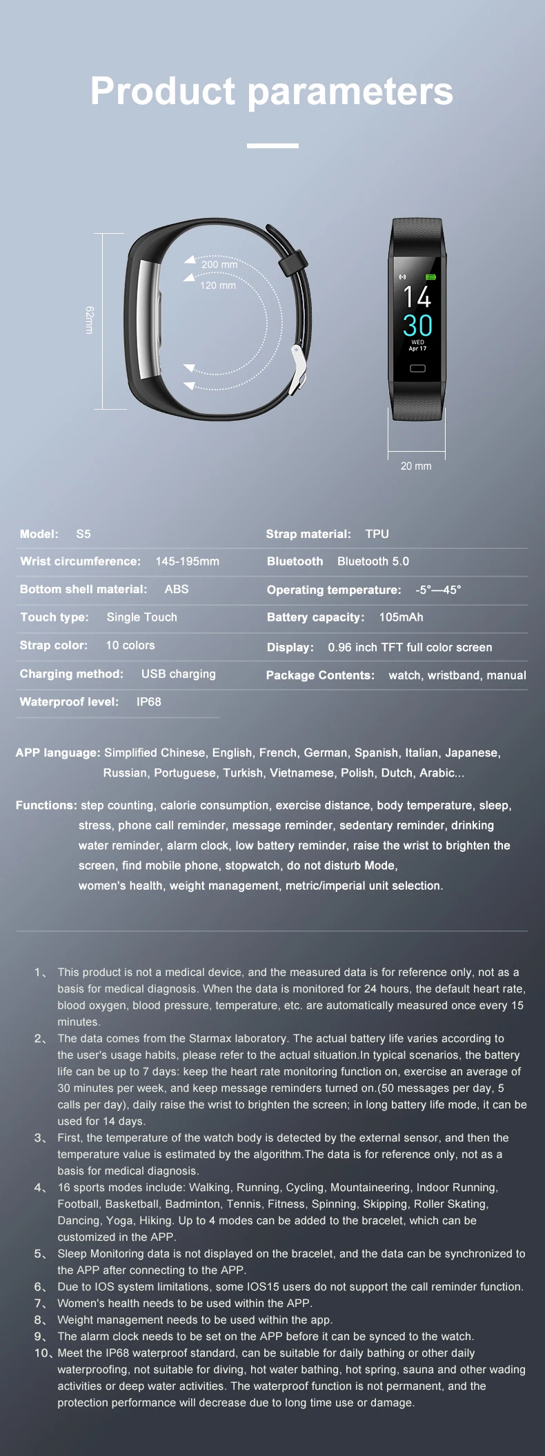 Men’s Sports Wristbands Women Bracelet Temperature Measurement Blood Pressure Fitness Heart Rate Pedometer Smart Bracelet Watch