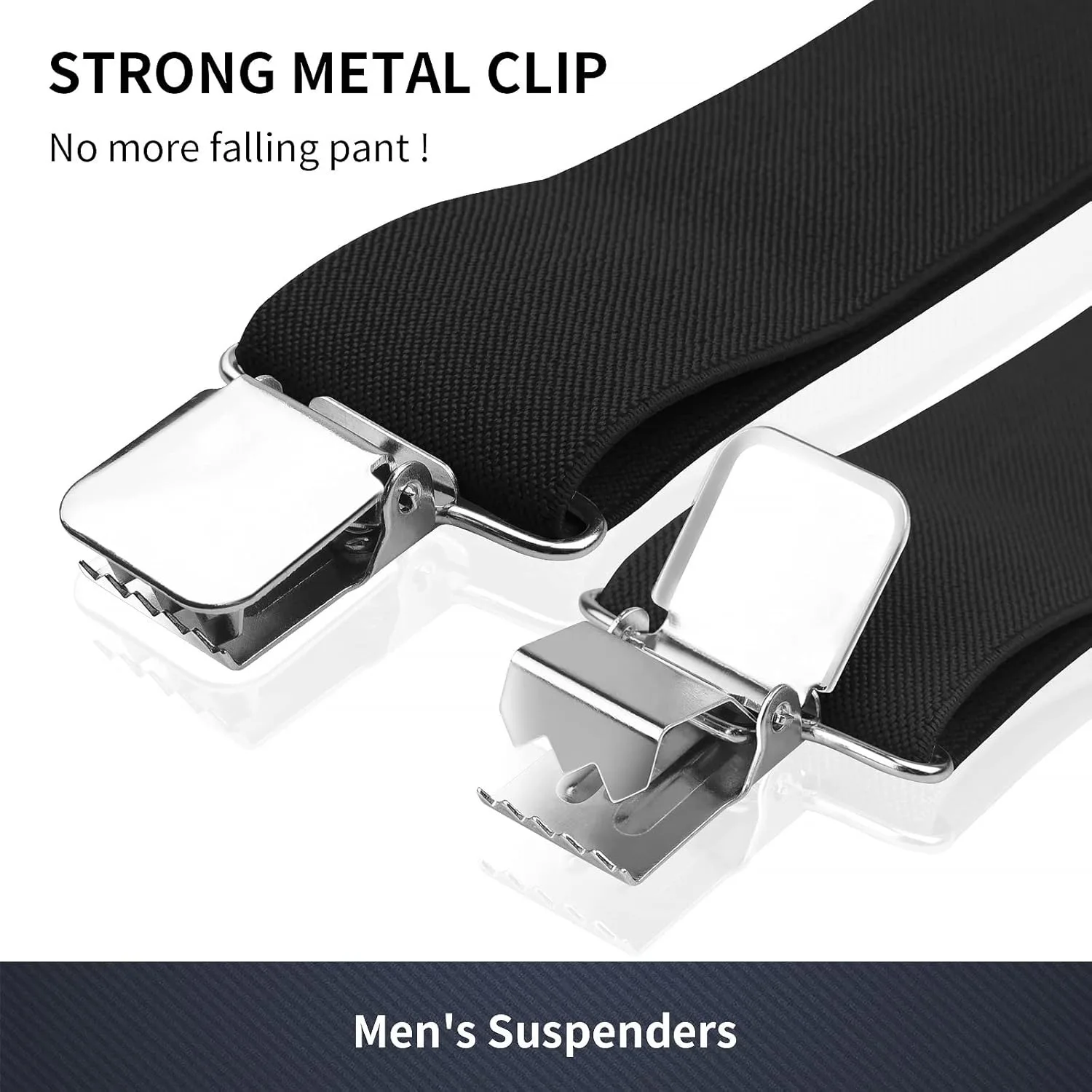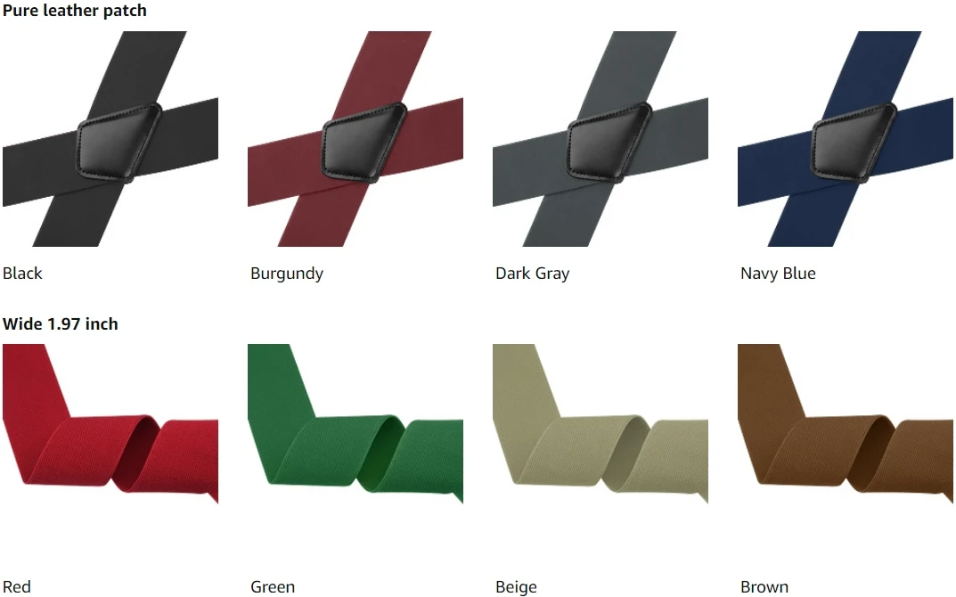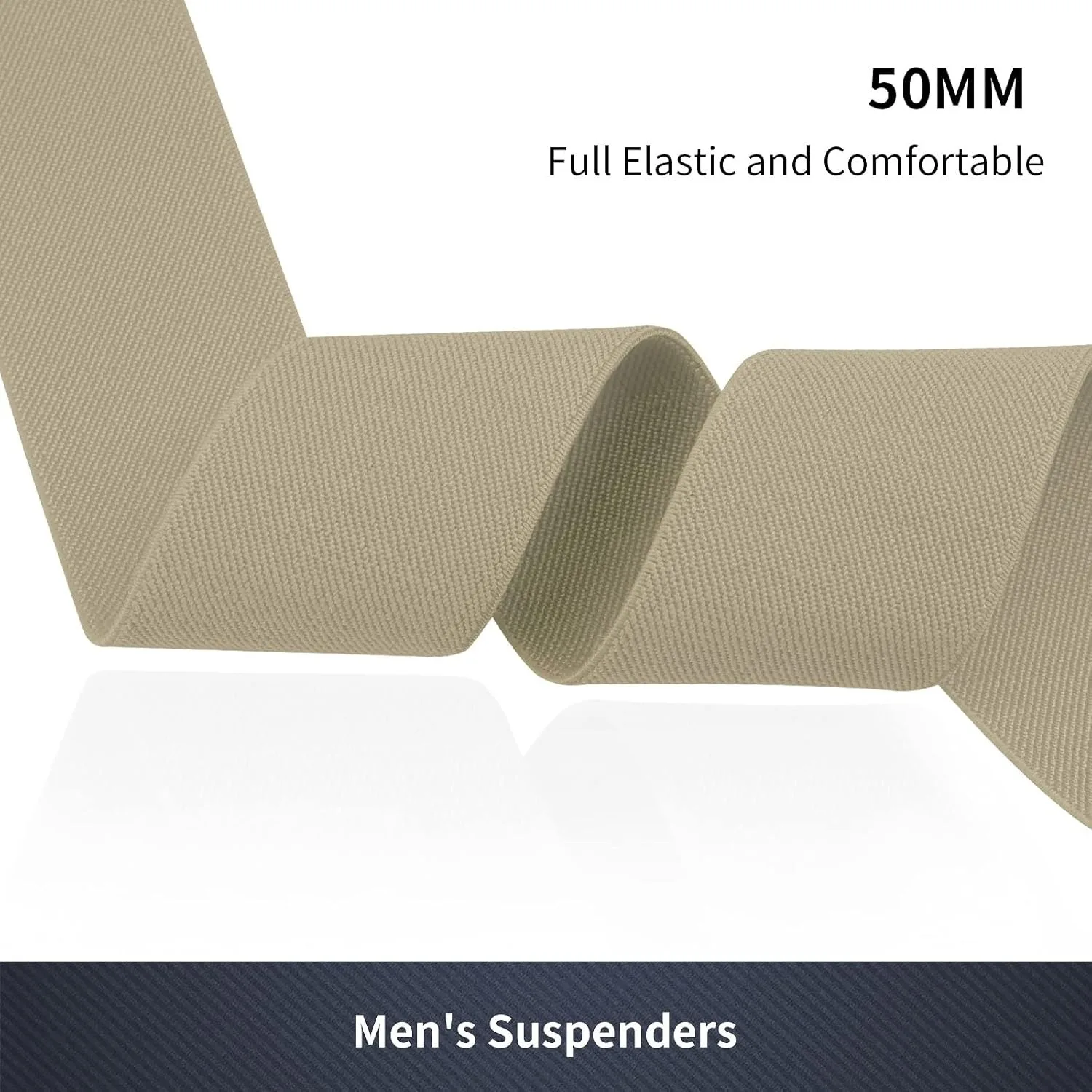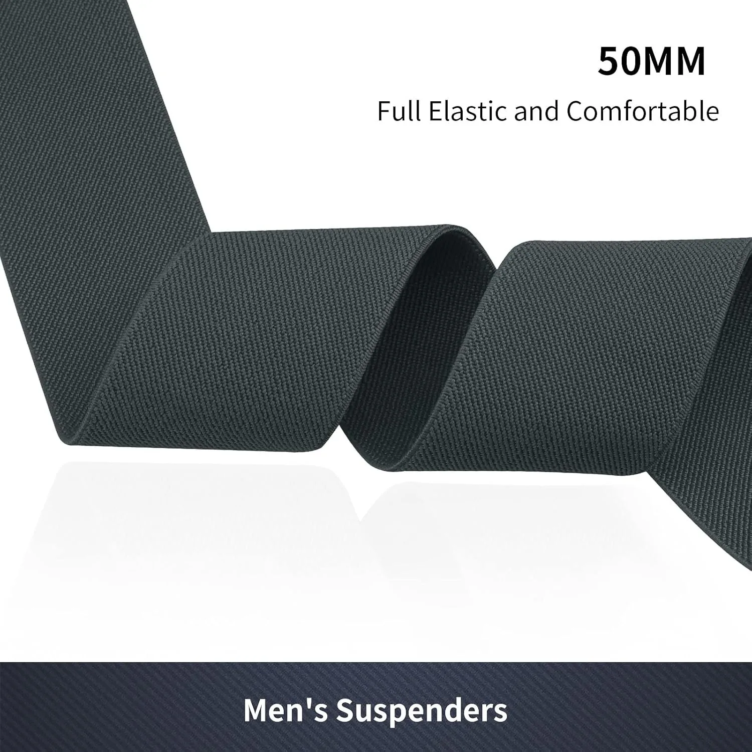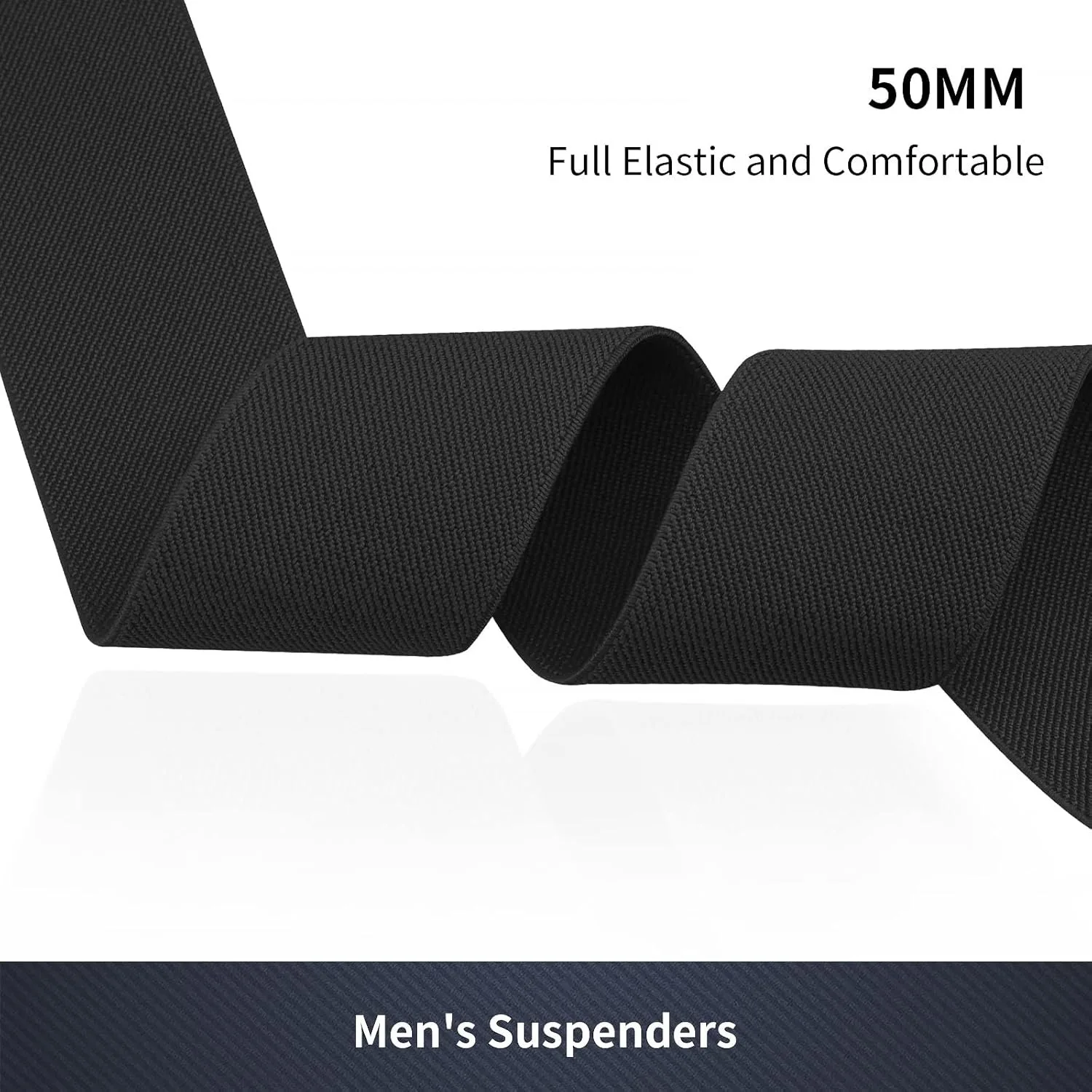 74% polyester,26% elastodiene. 2 inch(5cm) Wide, Overall length is 48 inch(120cm), Heavy duty Suspenders X-back shape design. Entire piece to be full elastic, Well made, No fraying issues, No stiff, Very strong, Not stretched out or become loose even worn daily.