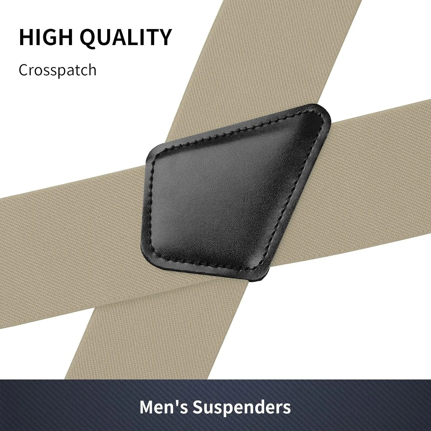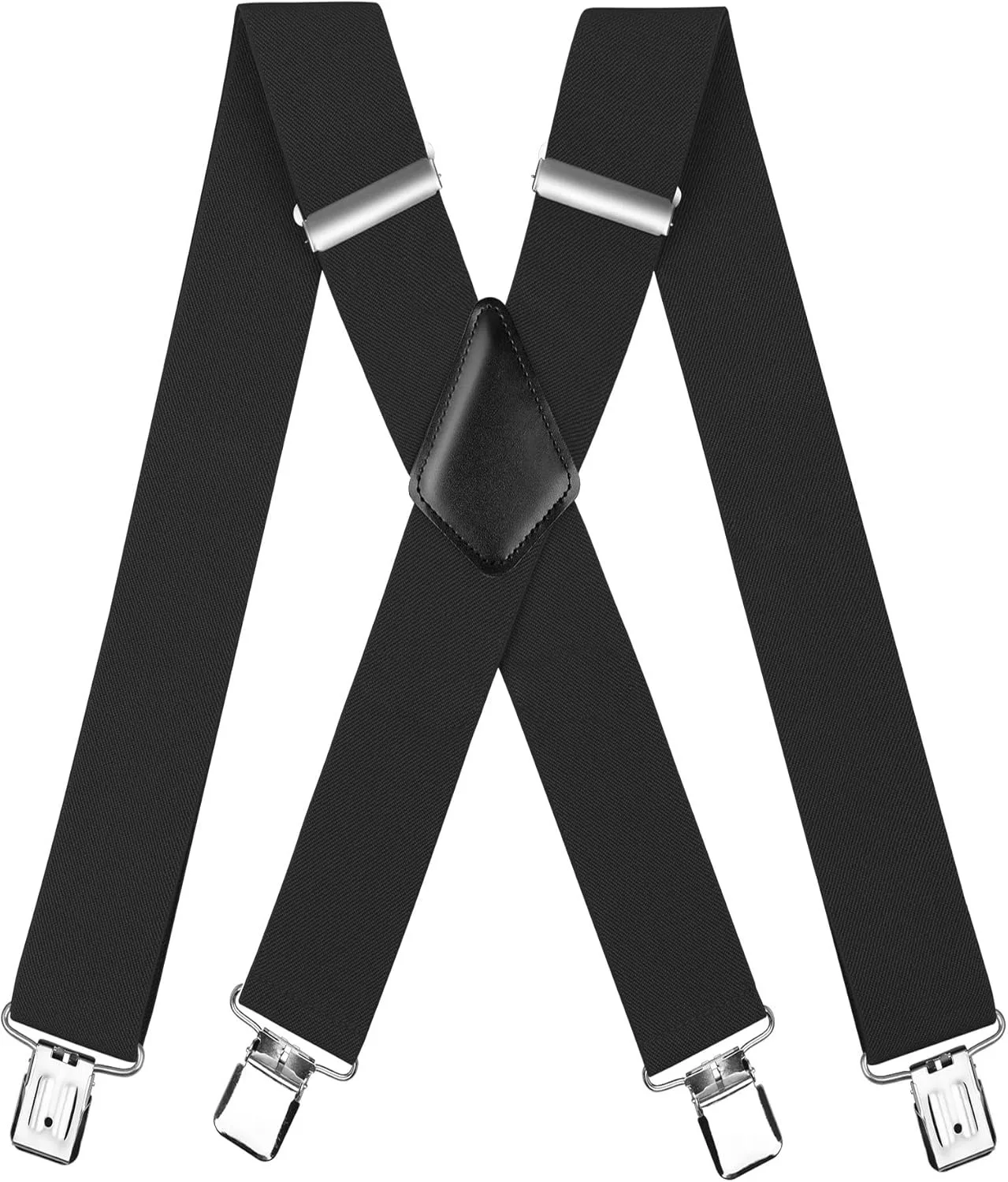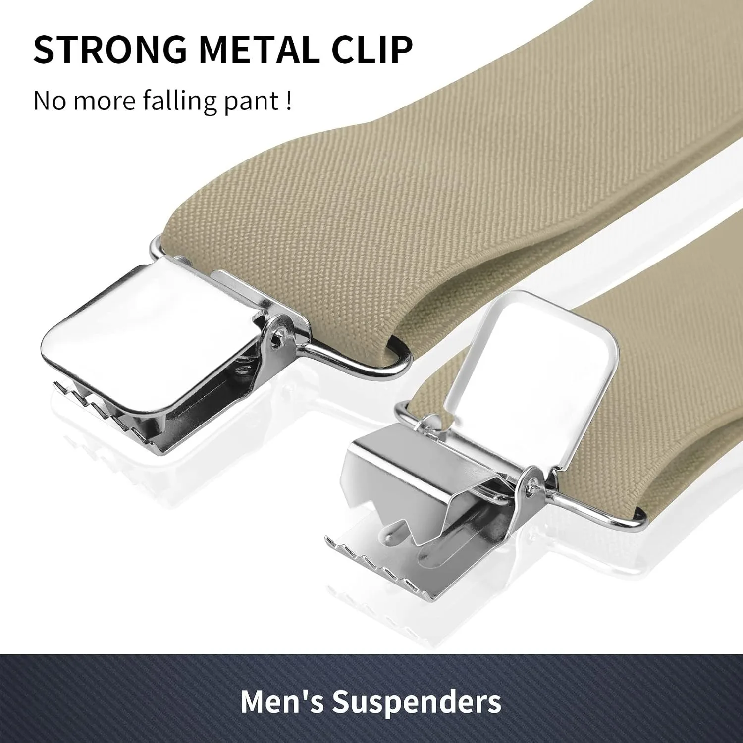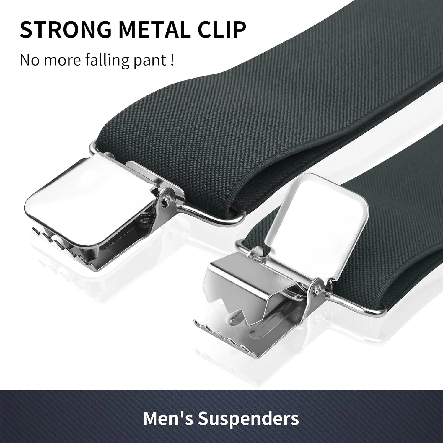 74% polyester,26% elastodiene. 2 inch(5cm) Wide, Overall length is 48 inch(120cm), Heavy duty Suspenders X-back shape design. Entire piece to be full elastic, Well made, No fraying issues, No stiff, Very strong, Not stretched out or become loose even worn daily.