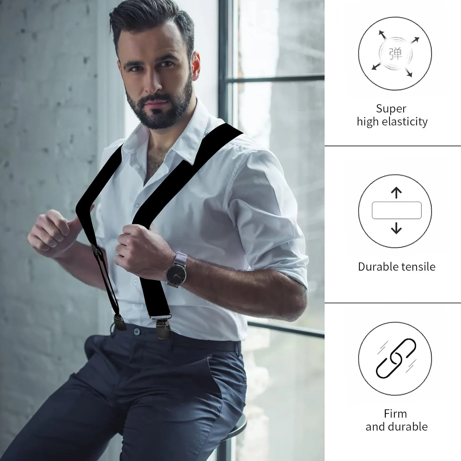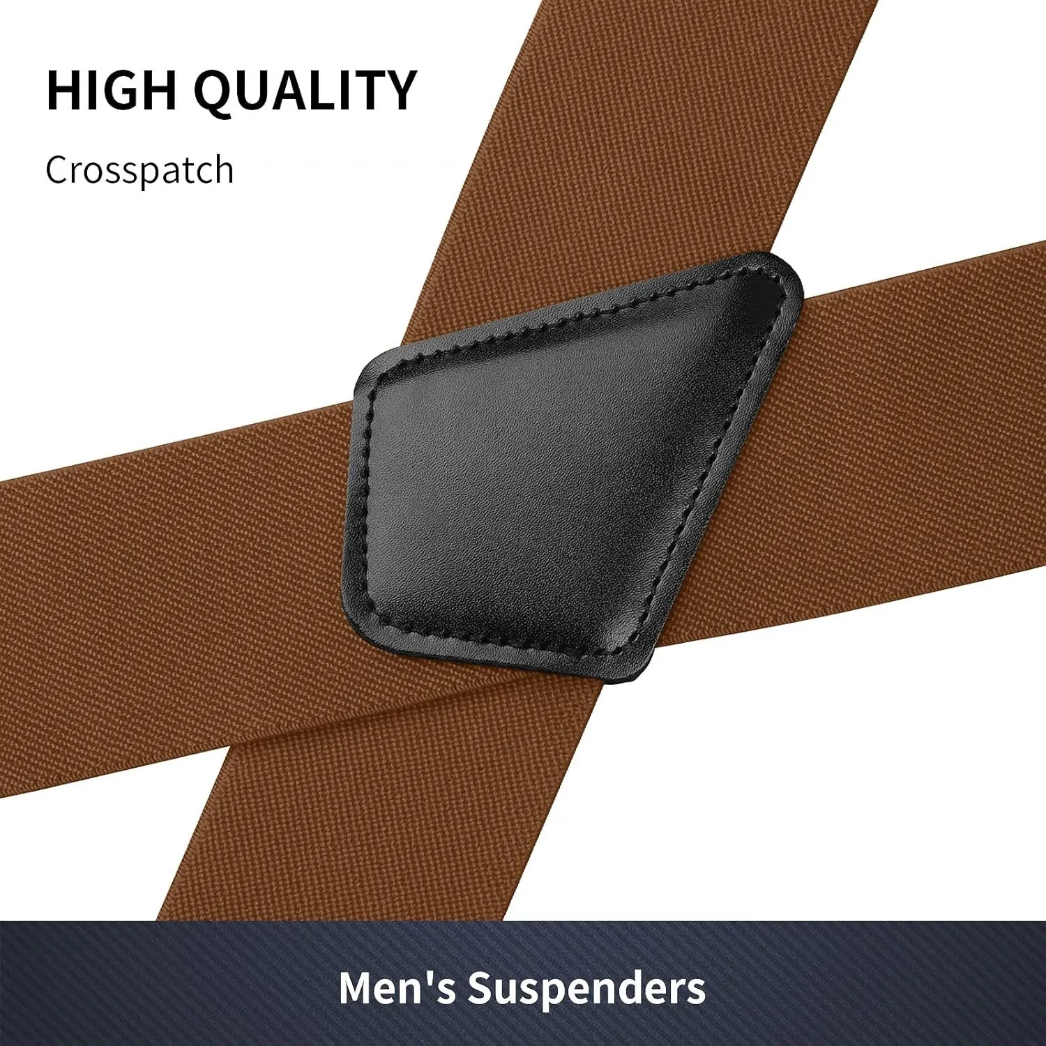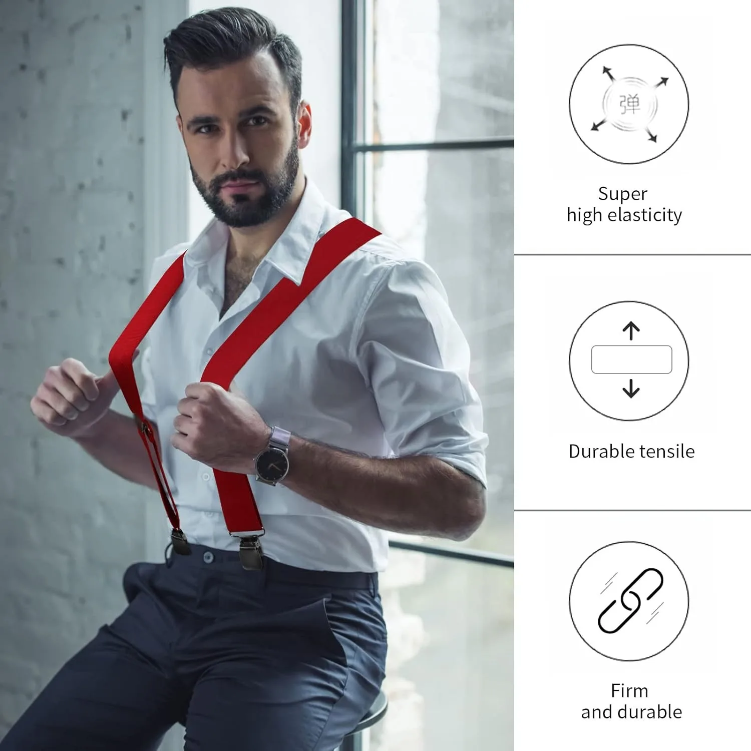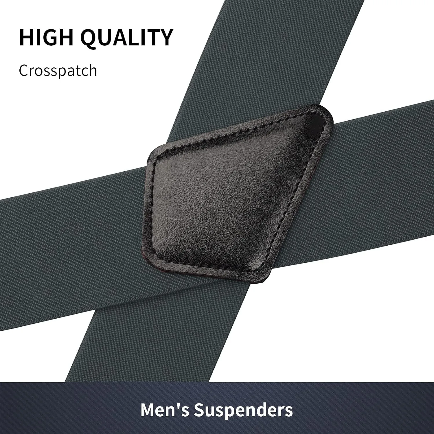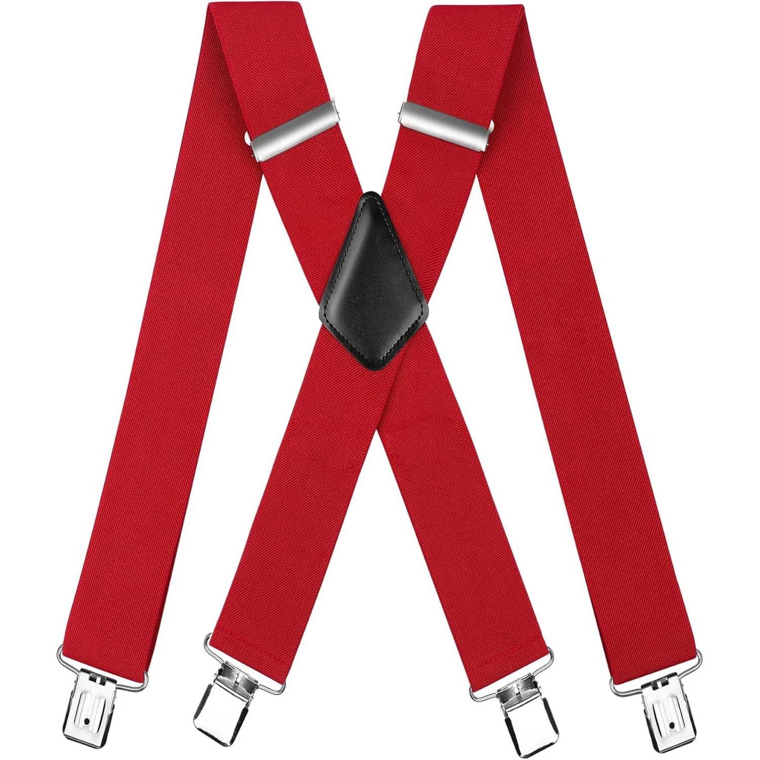 74% polyester,26% elastodiene. 2 inch(5cm) Wide, Overall length is 48 inch(120cm), Heavy duty Suspenders X-back shape design. Entire piece to be full elastic, Well made, No fraying issues, No stiff, Very strong, Not stretched out or become loose even worn daily.