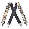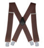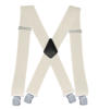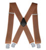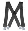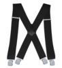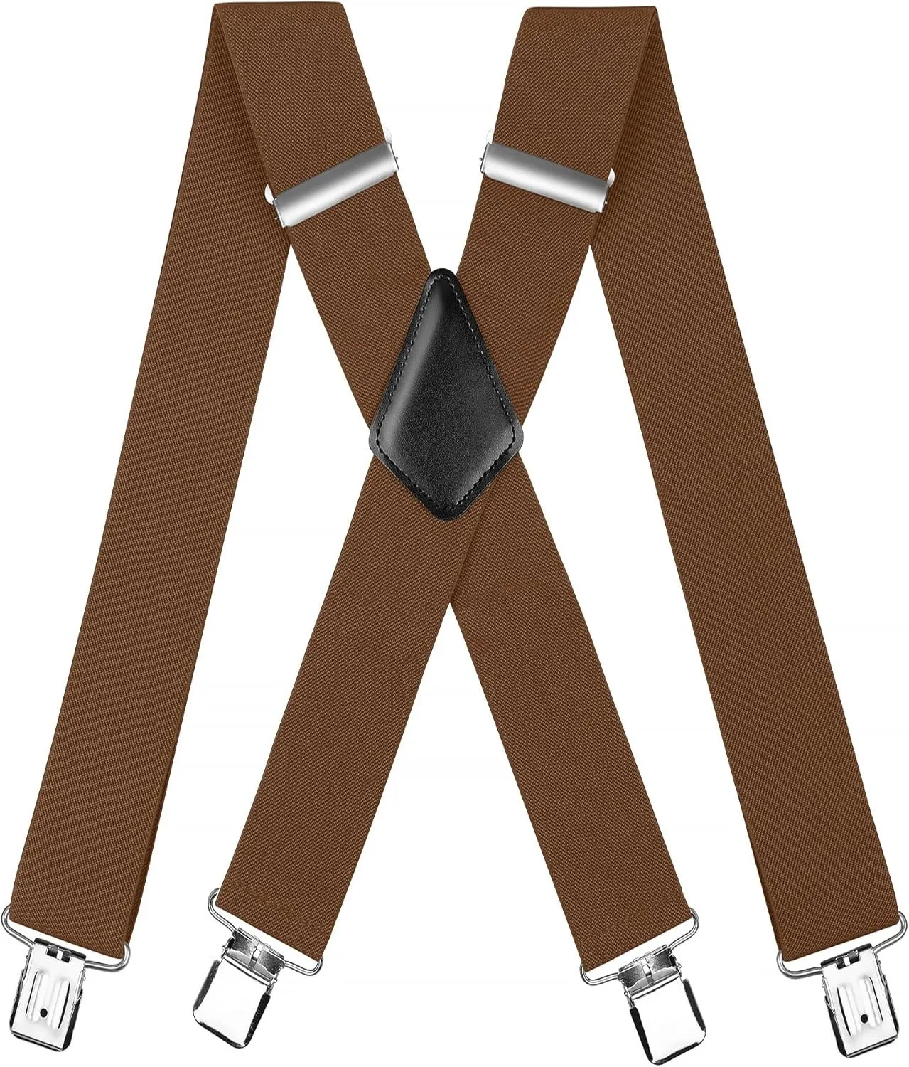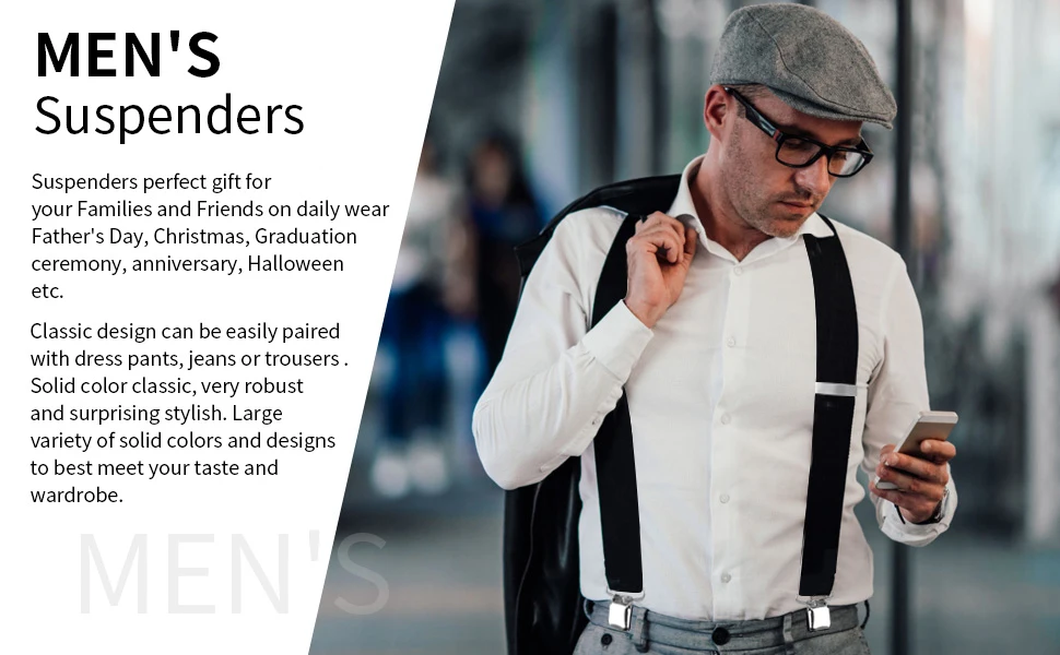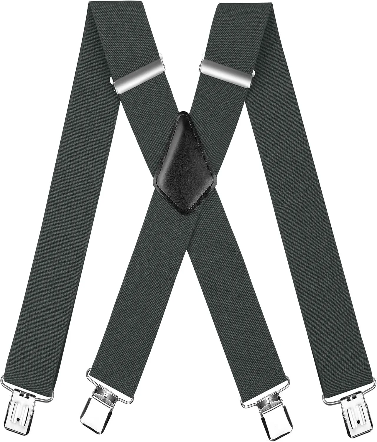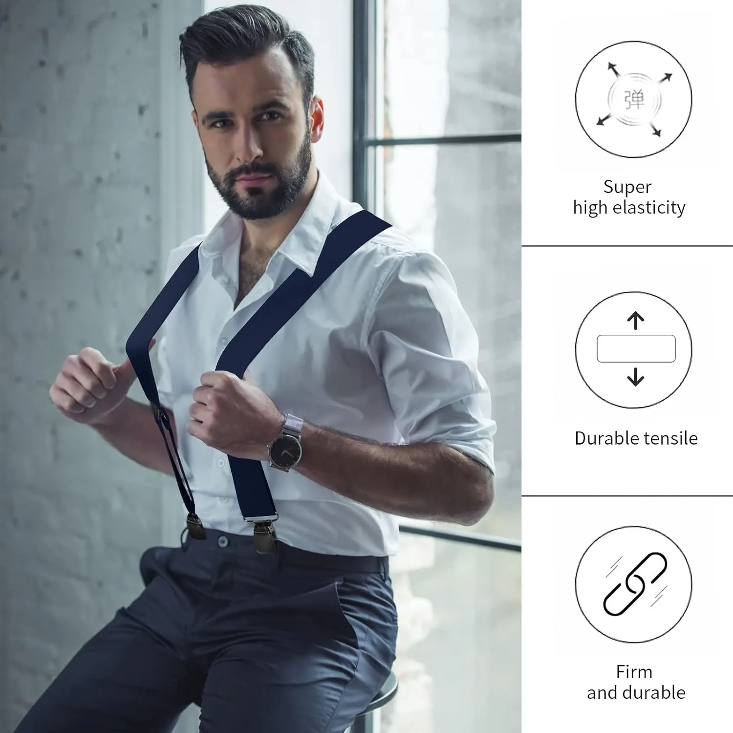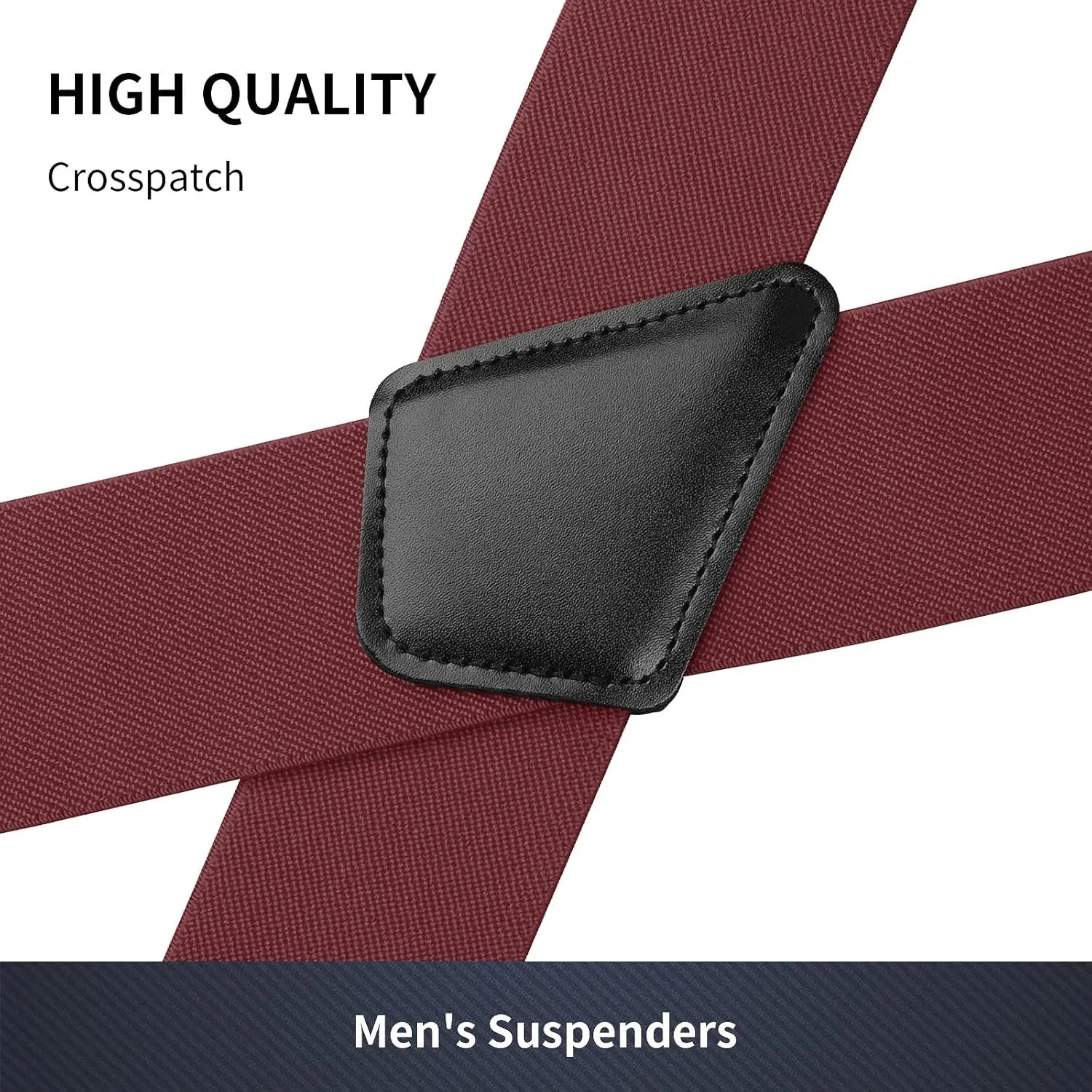 74% polyester,26% elastodiene. 2 inch(5cm) Wide, Overall length is 48 inch(120cm), Heavy duty Suspenders X-back shape design. Entire piece to be full elastic, Well made, No fraying issues, No stiff, Very strong, Not stretched out or become loose even worn daily.