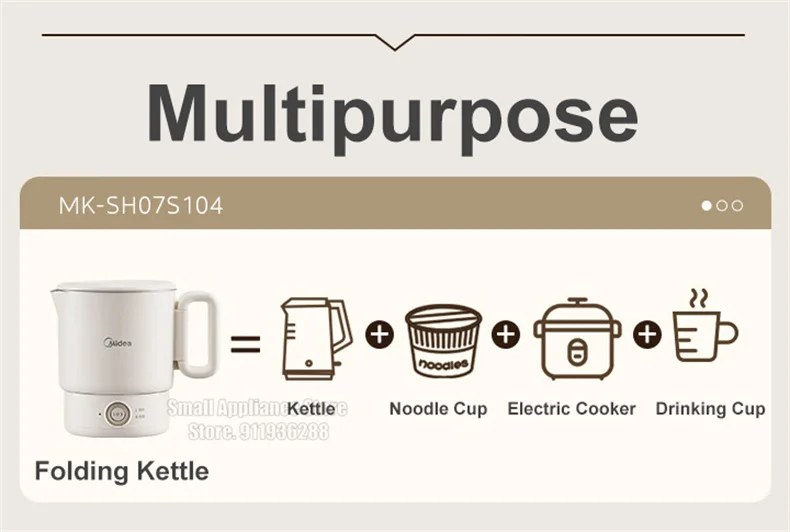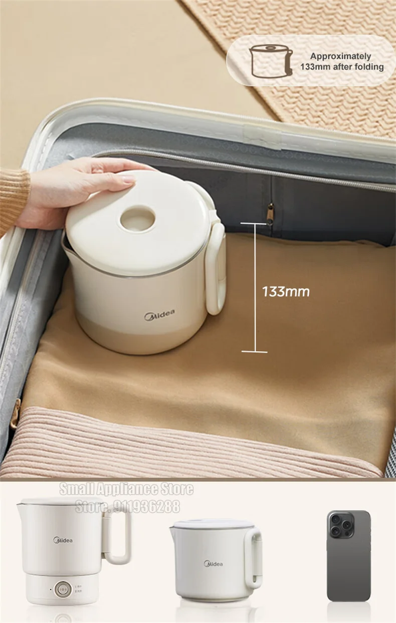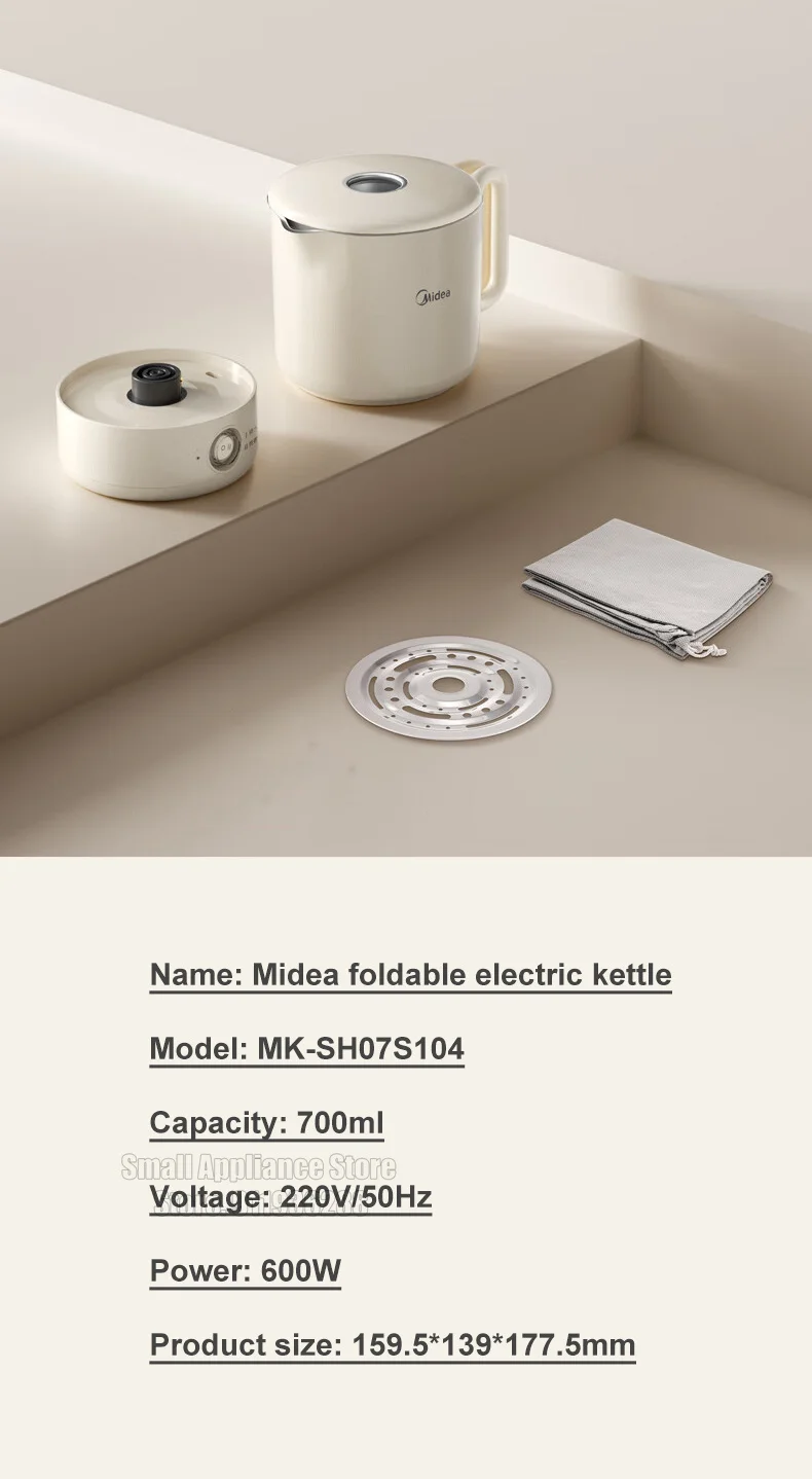 ●Midea foldable electric kettle, 700ml capacity, with steam rack, approximately 133mm when folded, suitable for family dormitories, business trips, etc.;