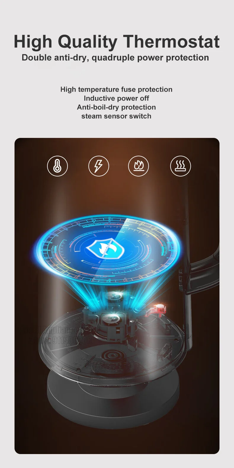 ●High-quality thermostat, double anti-dry protection, quadruple power protection (high temperature fuse protection; induction power off; anti-dry protection; steam induction switch)