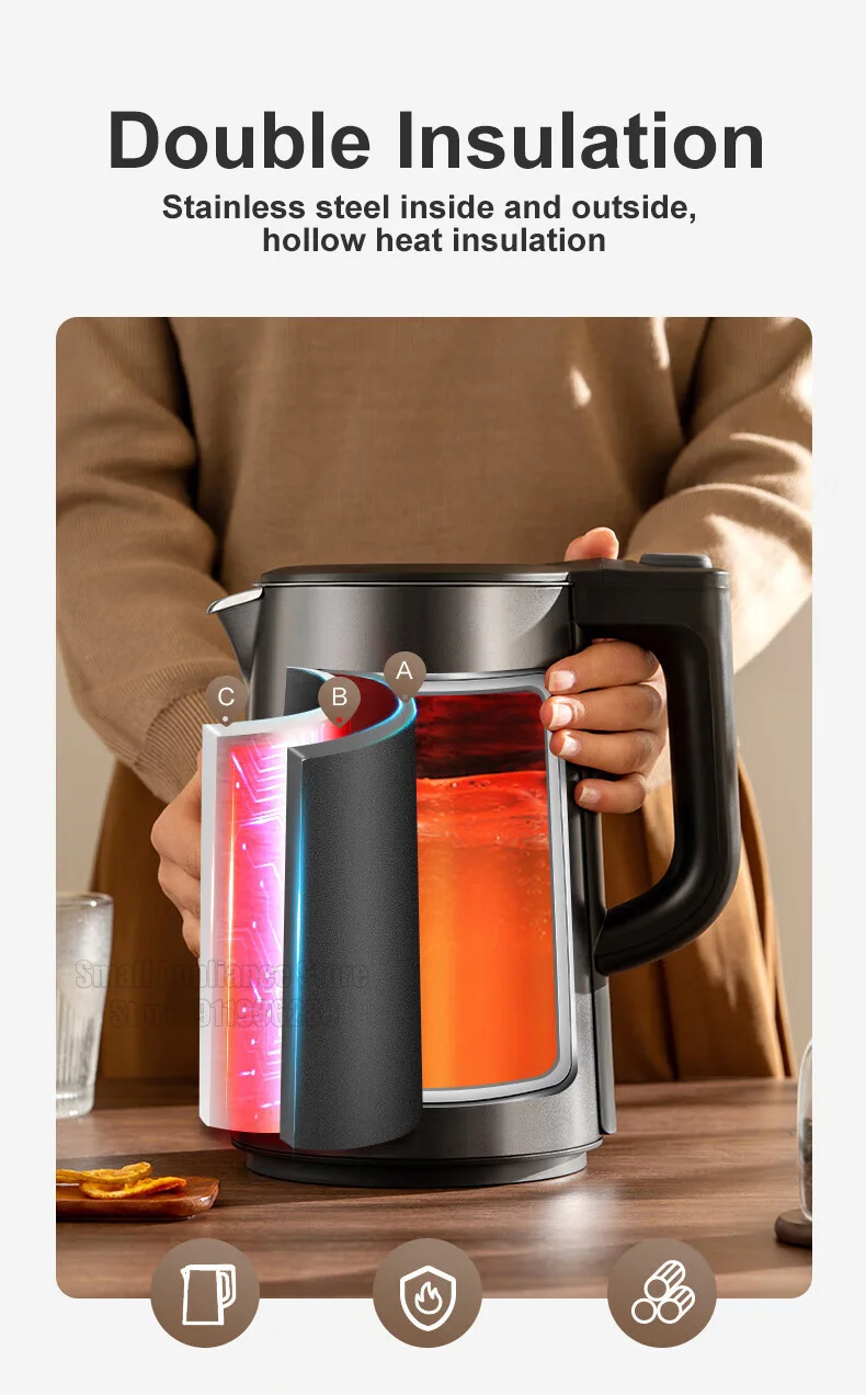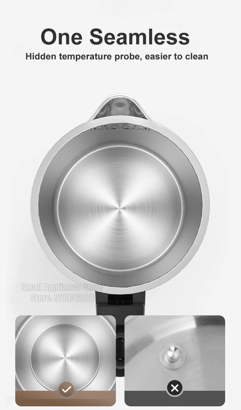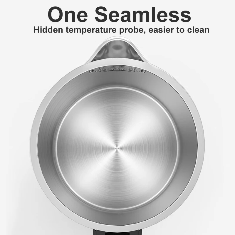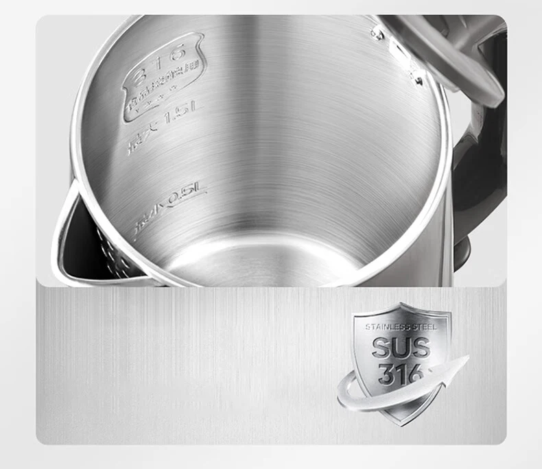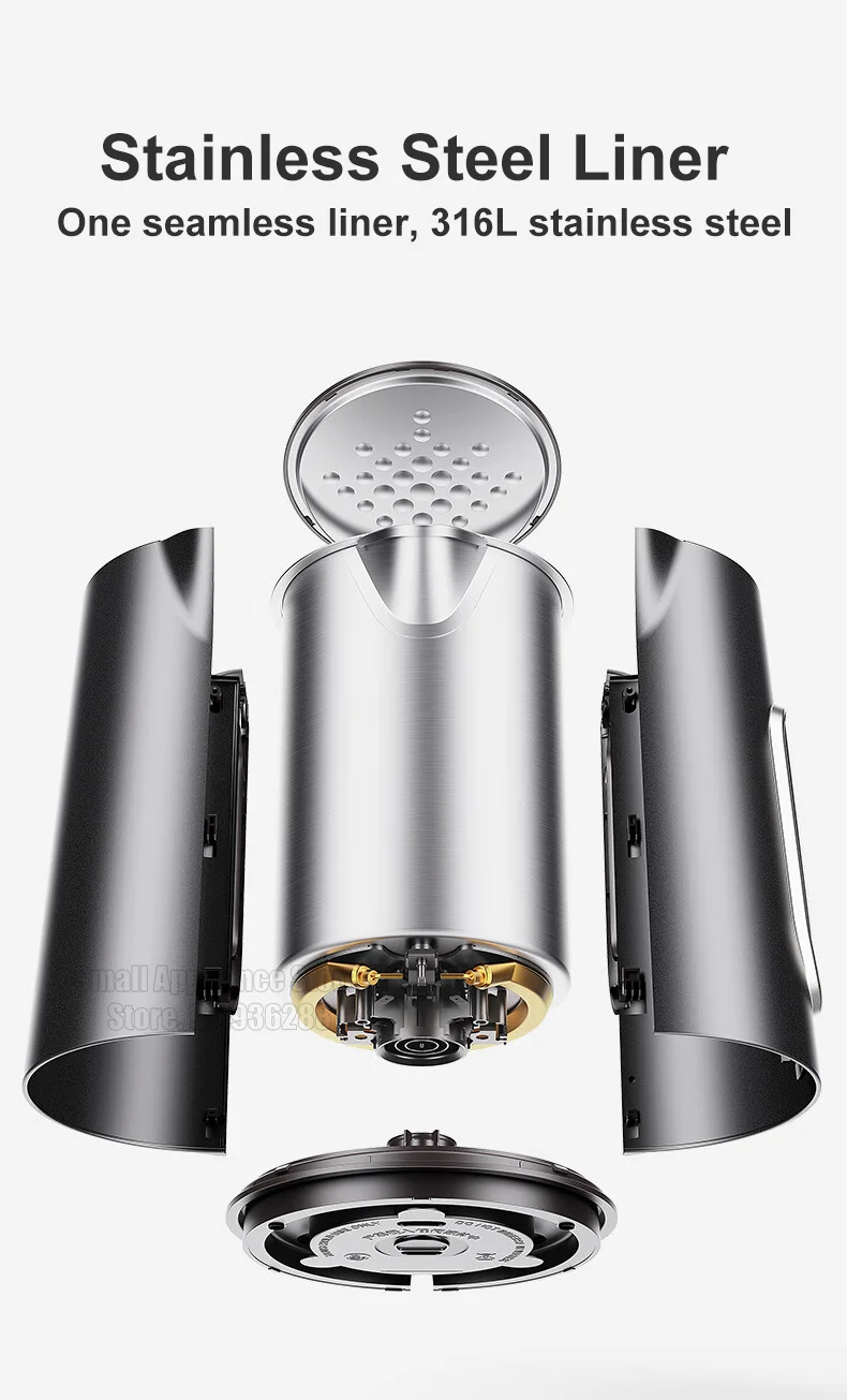 ●Double-layer 316L stainless steel electric kettle inside and outside, hidden temperature sensor, integrated seamless liner, easy to clean