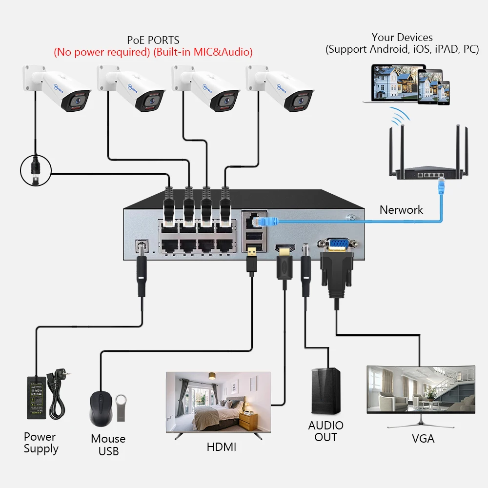 The Power over Ethernet (PoE) is an advanced technology, which enables you to use a single network cable for both video and power transmission, installation easier! Besides, thanks to PoE you will never worry about electric leaks!