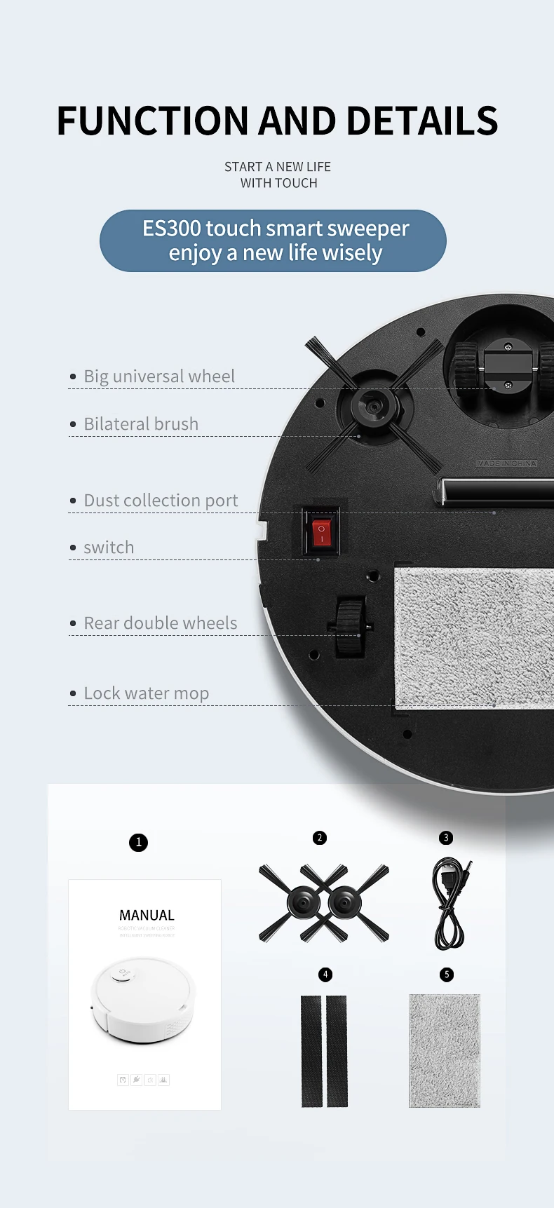 Kind reminder: This is an intelligent sweeping robot with a sweeping, suction, and dragging integrated design. Turning when encountering obstacles, relying on the bottom to absorb dirty cigarette butts, melon seed shells, dust, dog hair, and floor hair