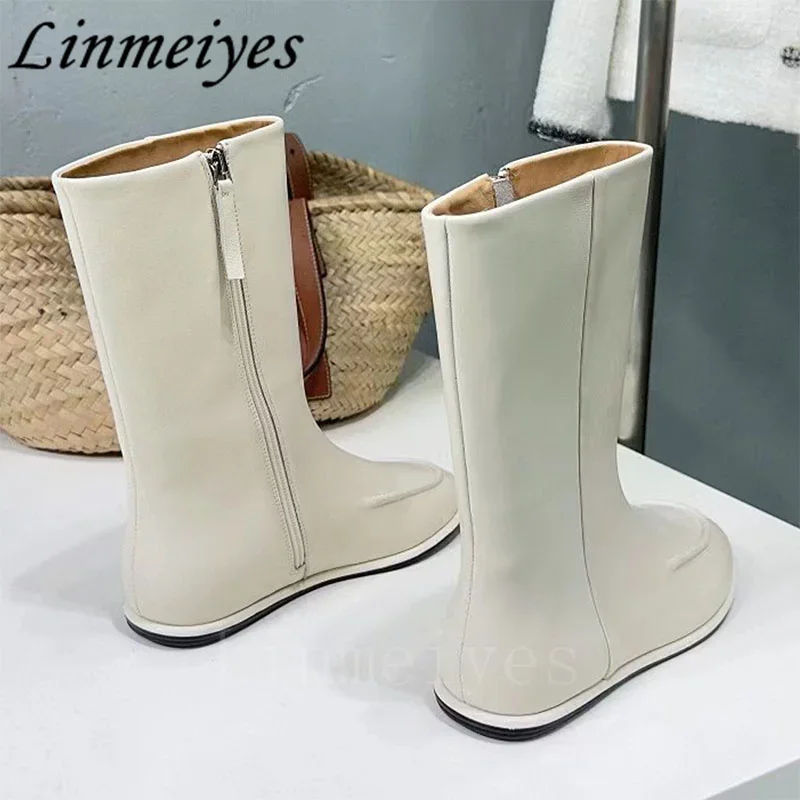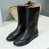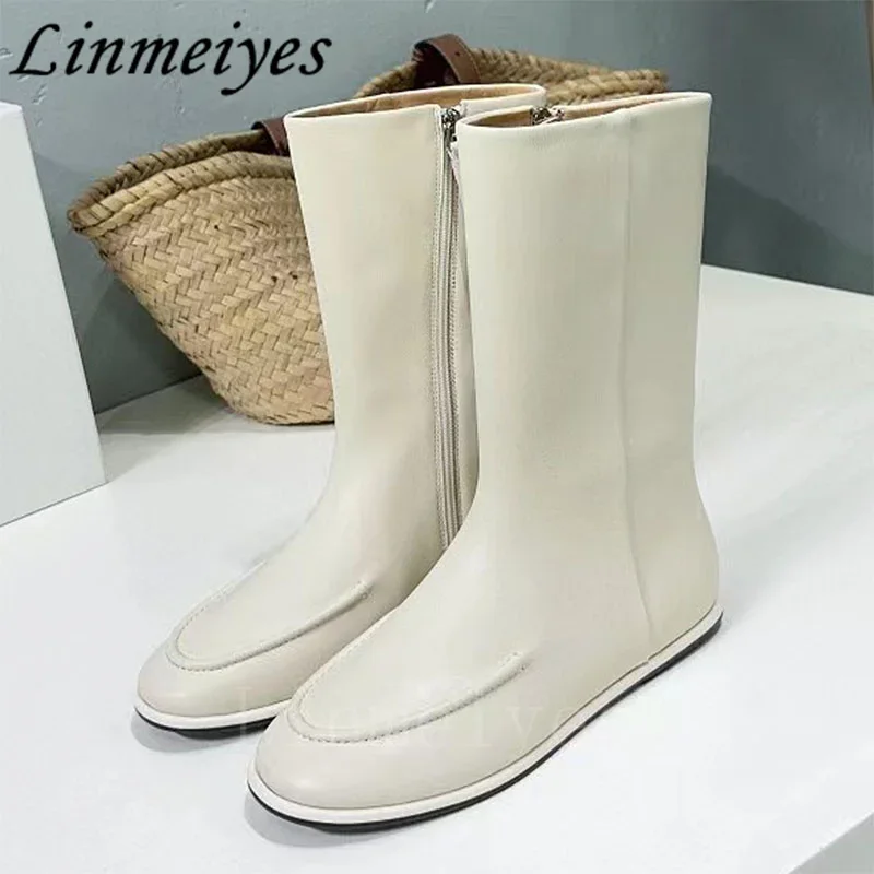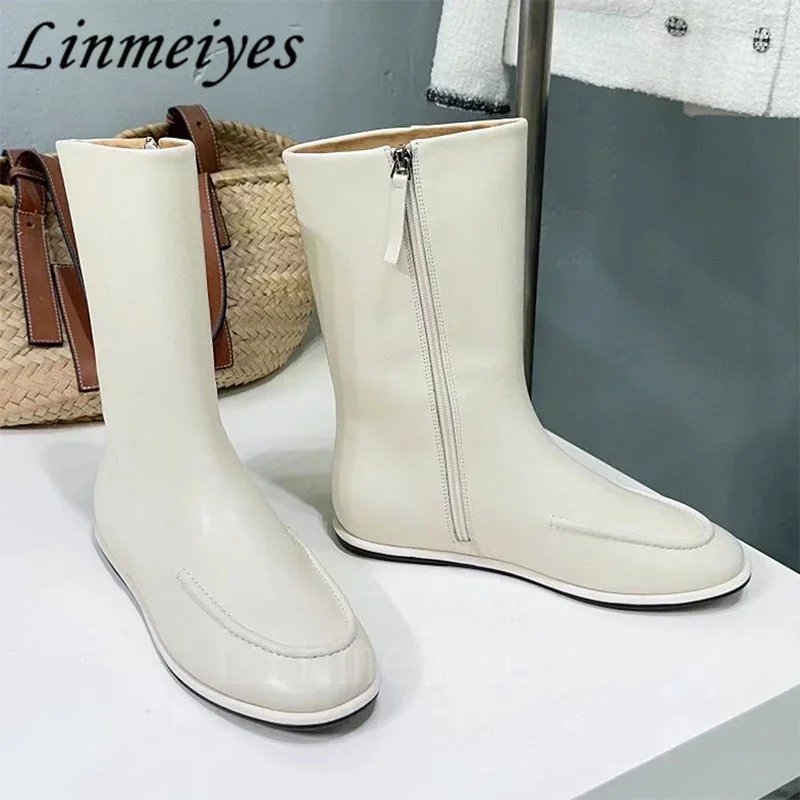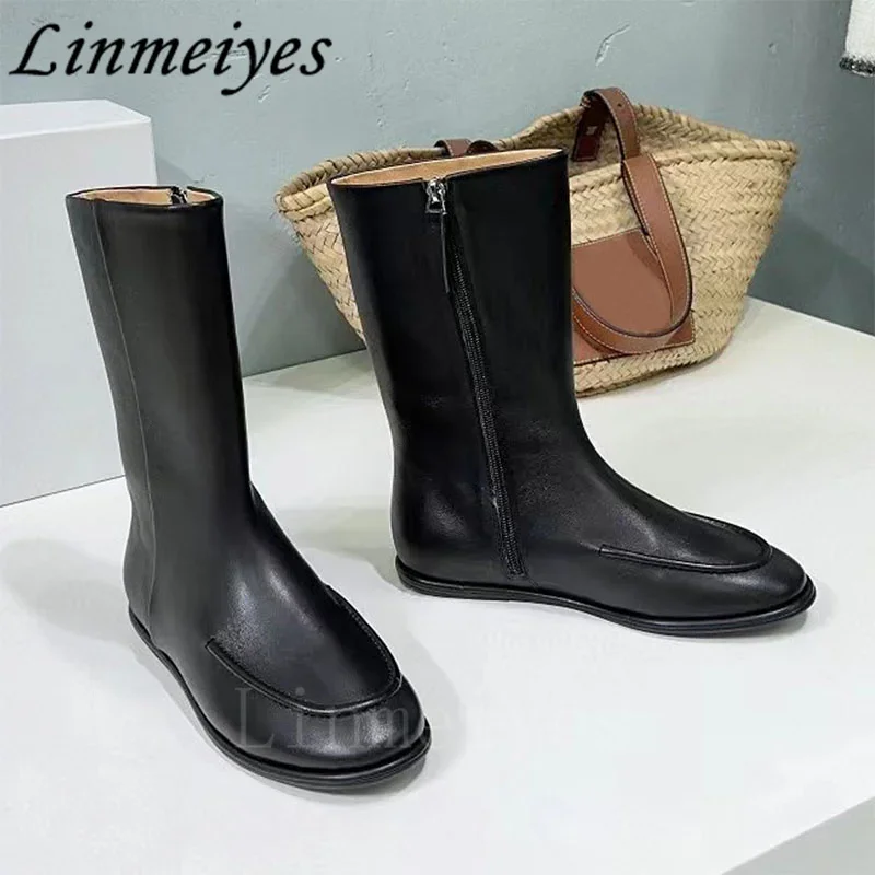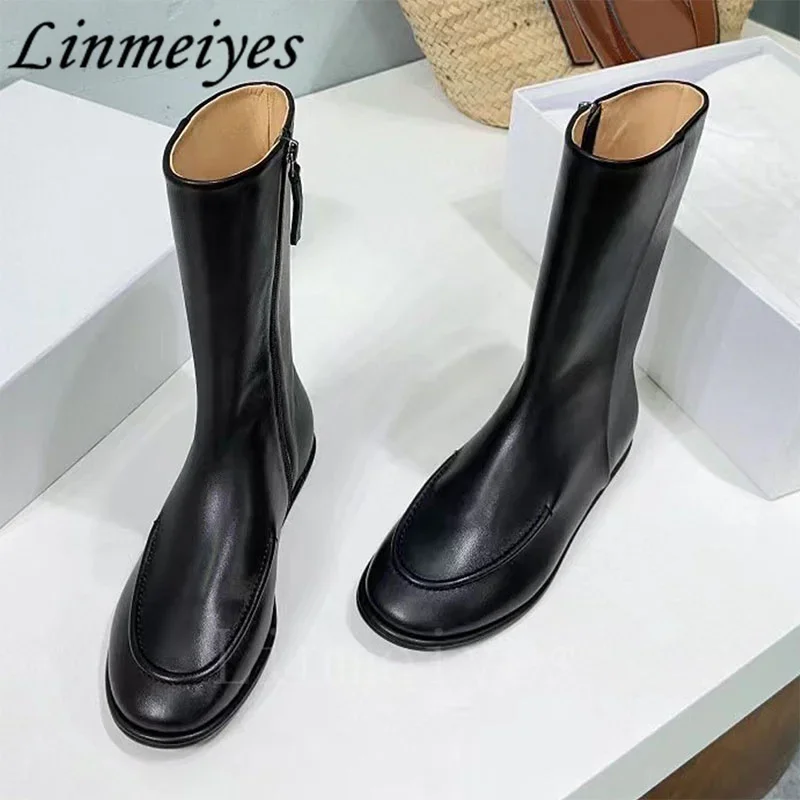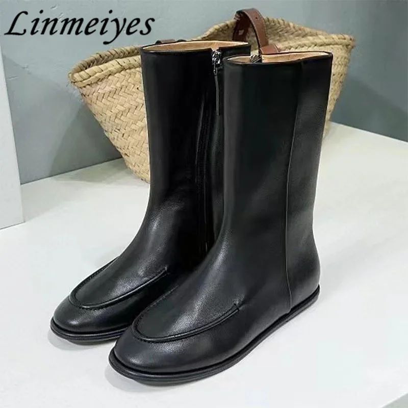 New Flat Short Boots Woman Genuine Leather Round Toe Knight Boots High Quality Flat Shoes Women Runway Mid-Calf Boots Women