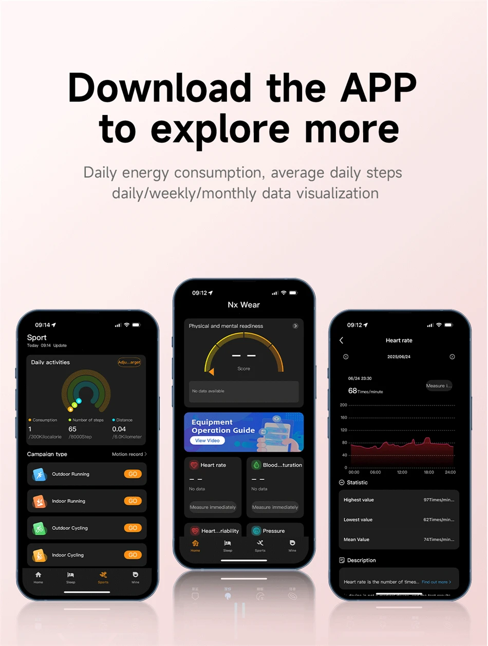 24H real-time monitoring, heart rate, blood oxygen, stress test, sleep monitoring(sleep time, sleep quality), multiple sports modes, step, step counting, camera control, multi-language (APP), access WeChat Sports & iOS Health.