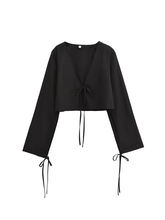 TRZA-V-Neck Tied Cropped Blouses for Women, Long Sleeve Shirts, Chic Tops, Female Fashion