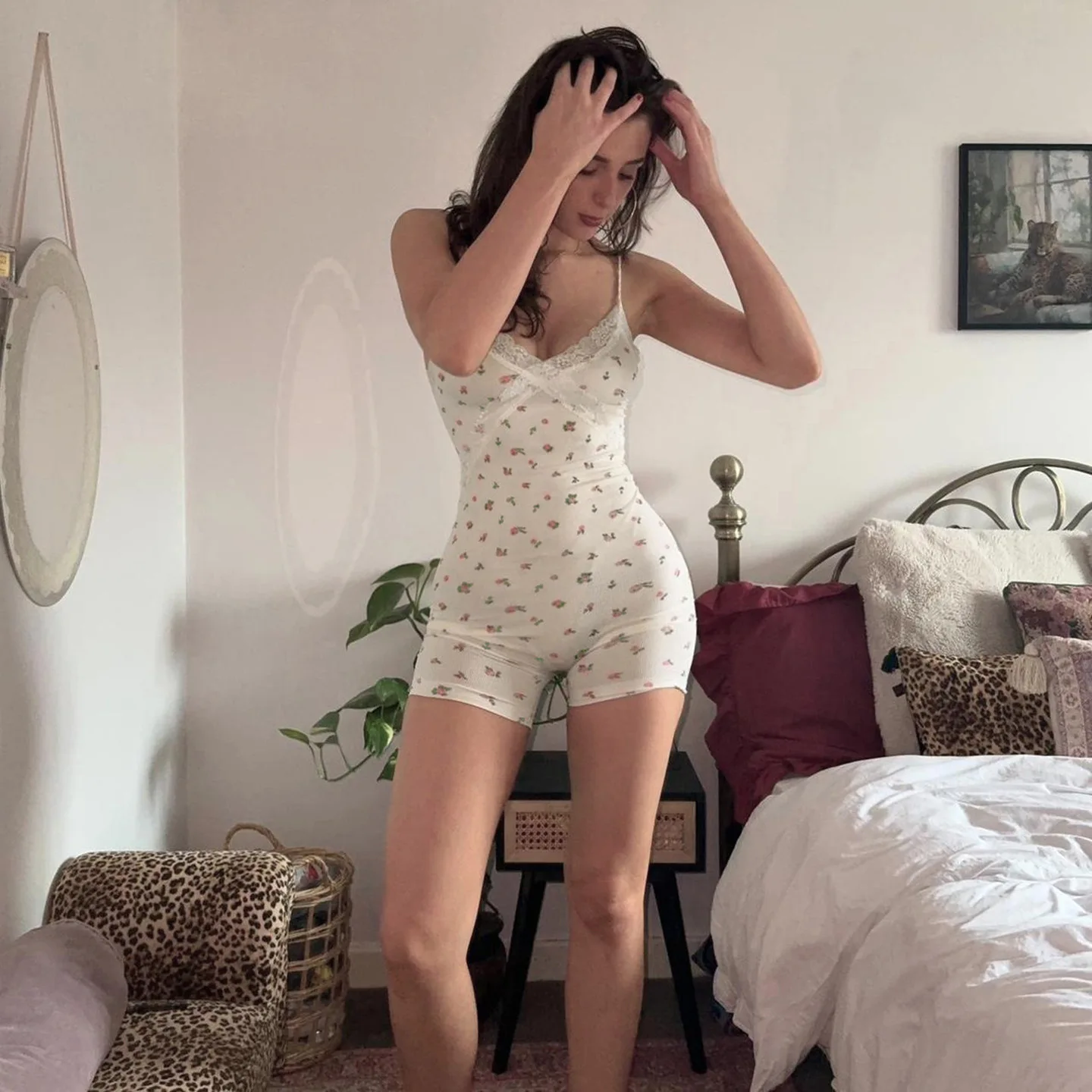 Oniflyme Floral Lace Patchwork Playsuit Women Spaghetti Strap V-Neck Backless Bodycon Rompers Streetwear Sexy Shorts Jumpsuits