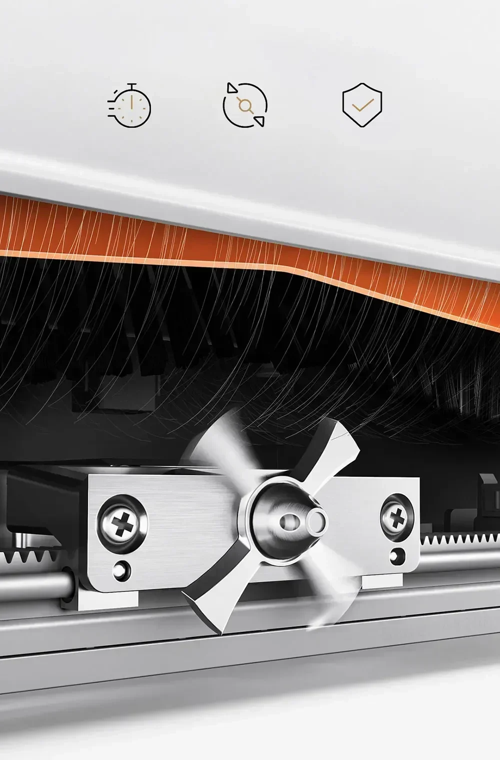 The base integrates automatic hair cutting technology. After completing the cleaning task and returning to the base, it rotates at 60 RPM and moves left and right to efficiently cut the hair entangled on the roller brush. At the same time, the strong suction power sucks the cut hair into the dustbin, solving the problem of hair entanglement in one go.