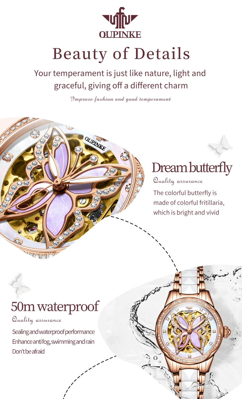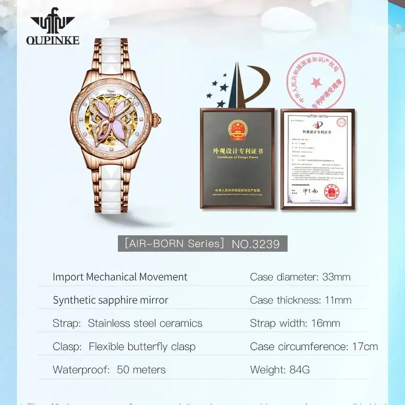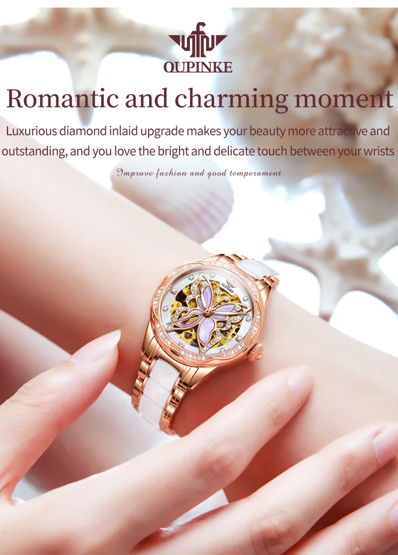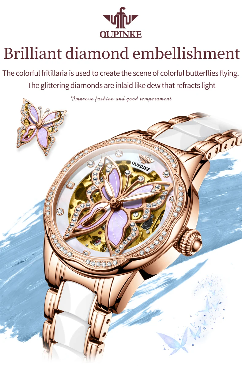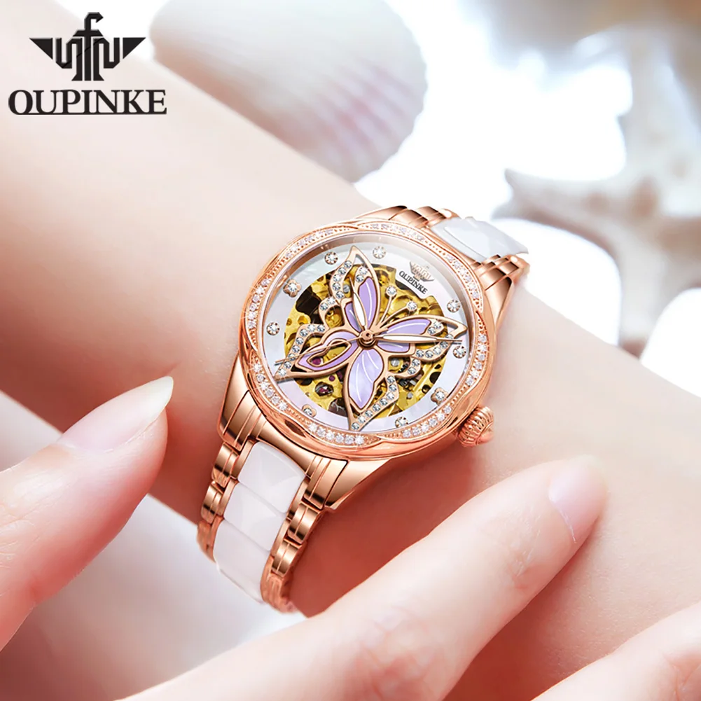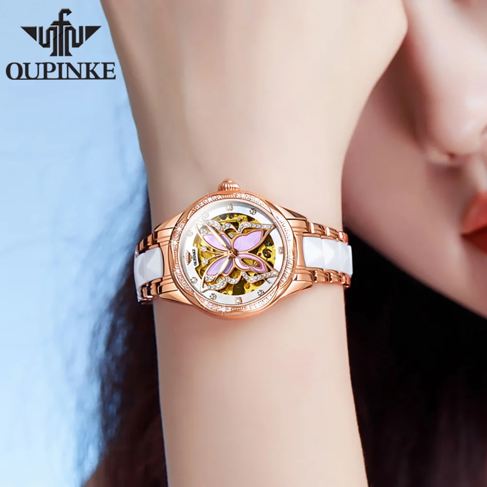 OUPINKE 3239 Automatic Watches for Women Diamond Butterfly Design Imported Movement Ceramics Watchband Elegant Women’s Watches