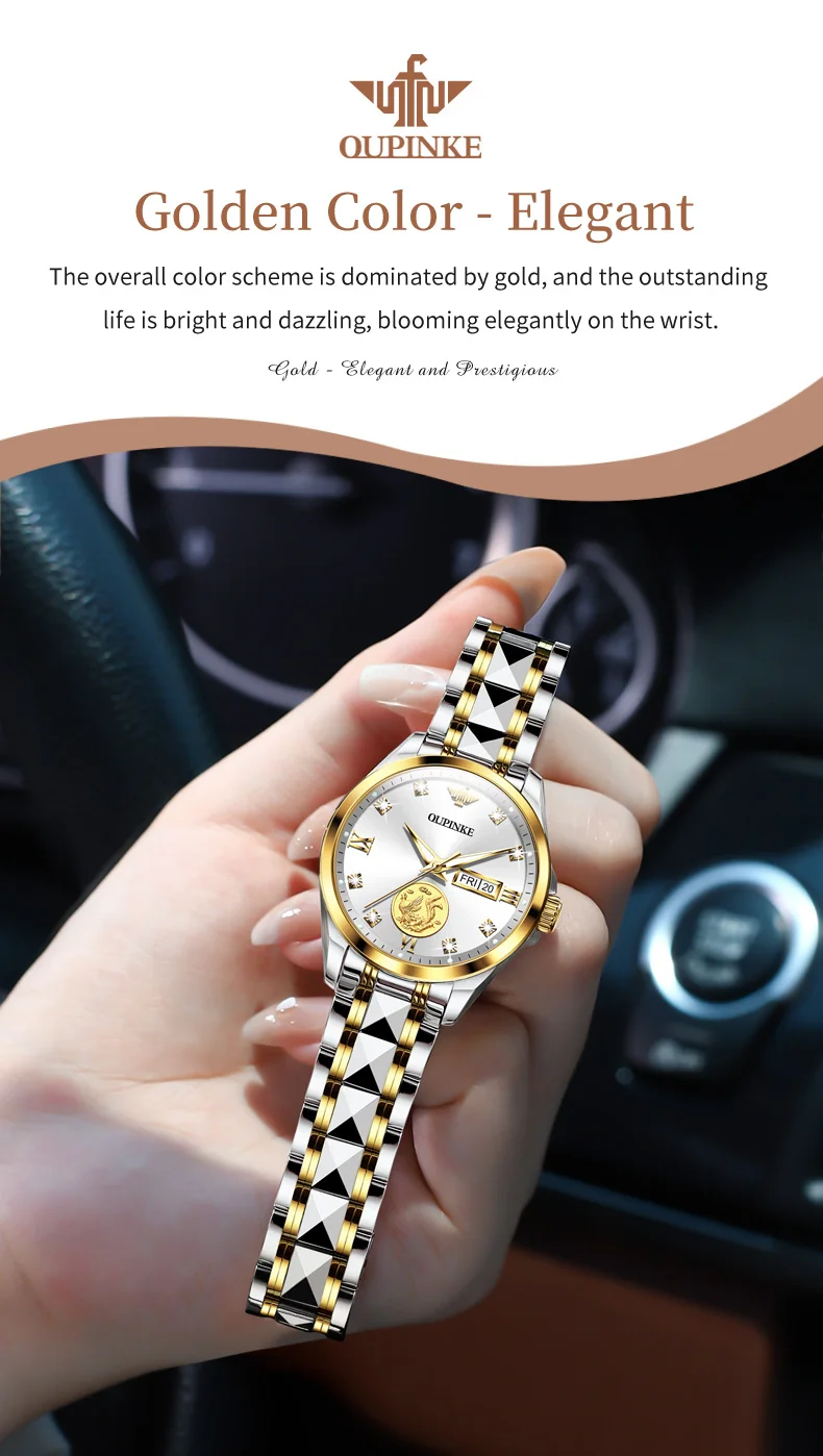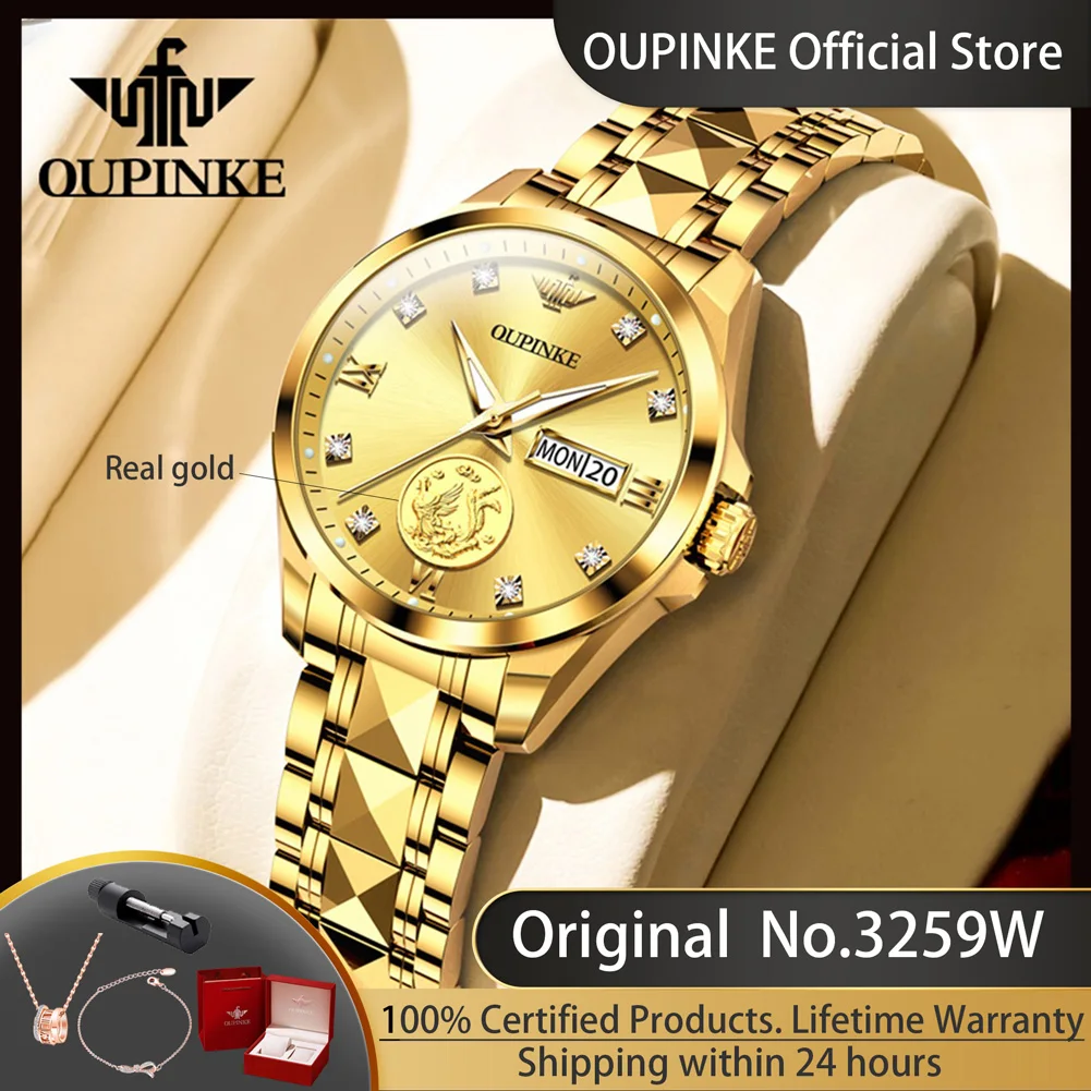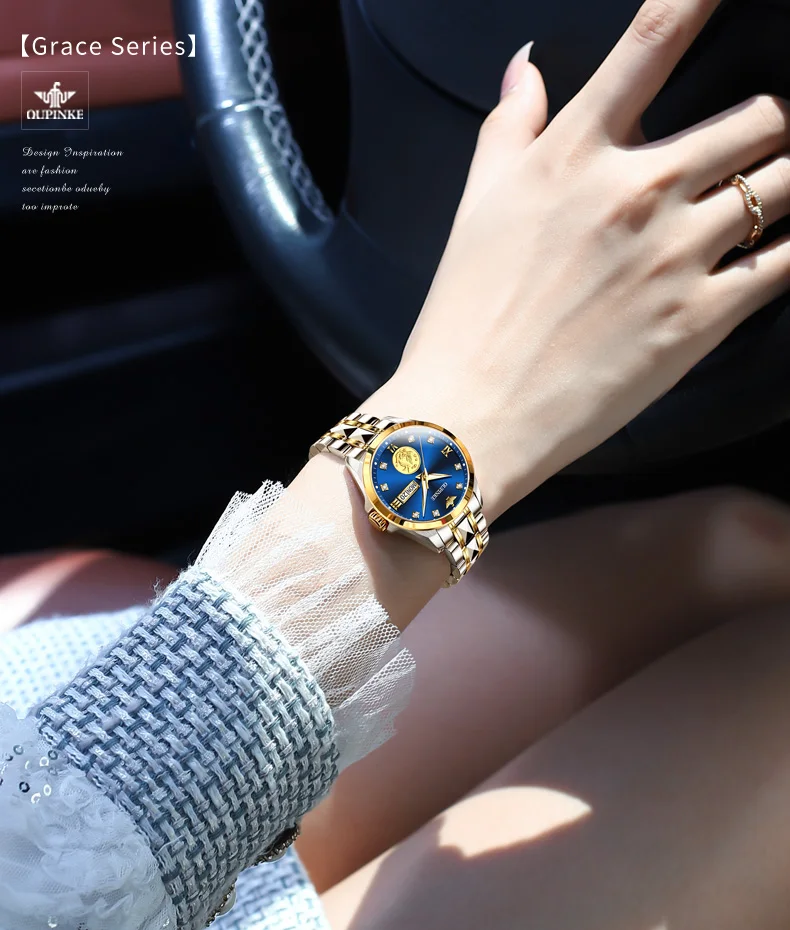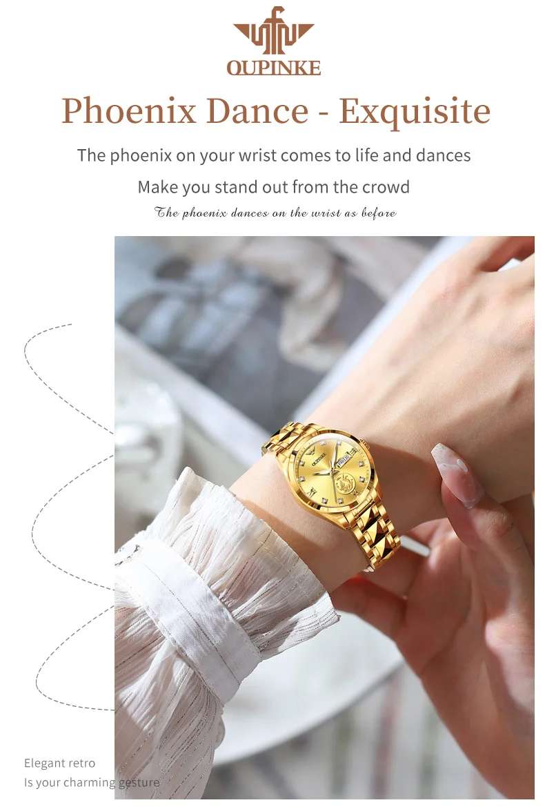 OUPINKE 3259 Dual Calendar Mechanical Watch For Women Real Gold Luxury Ladies Hand Clock Stainless Steel Original Woman Watches