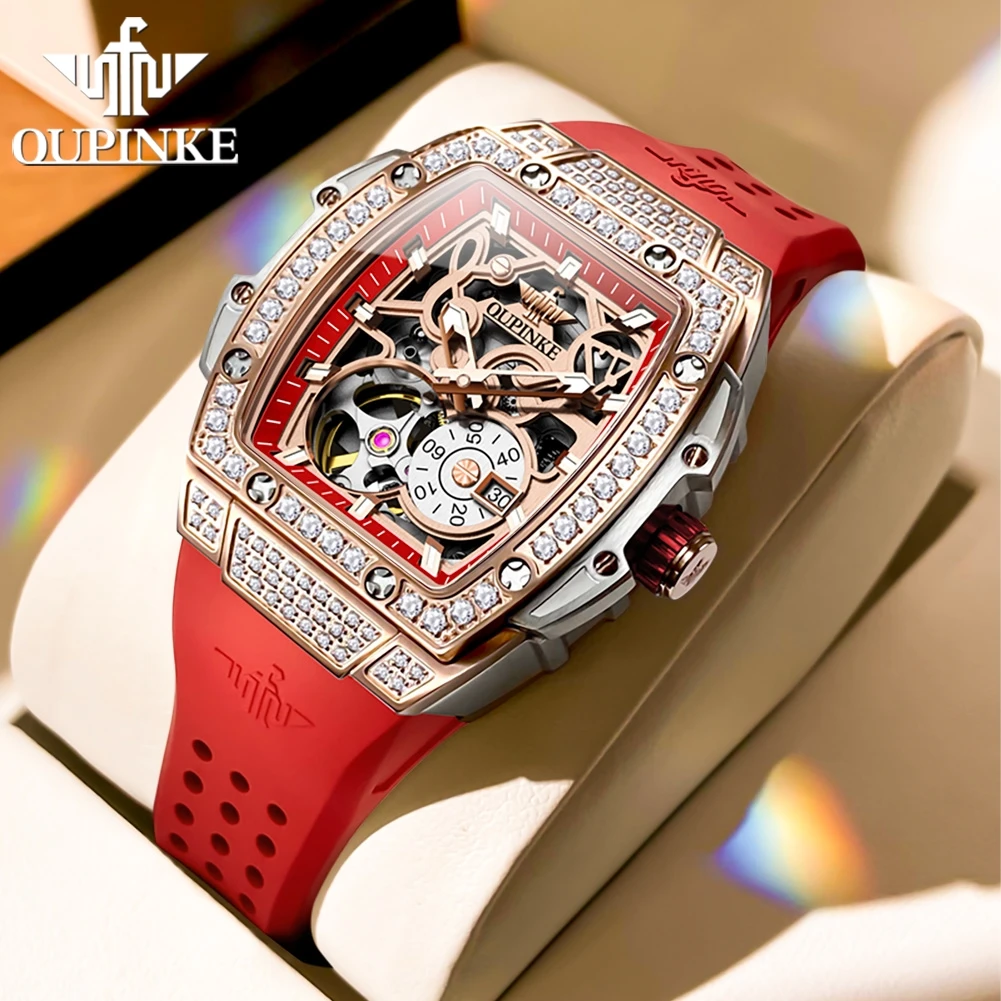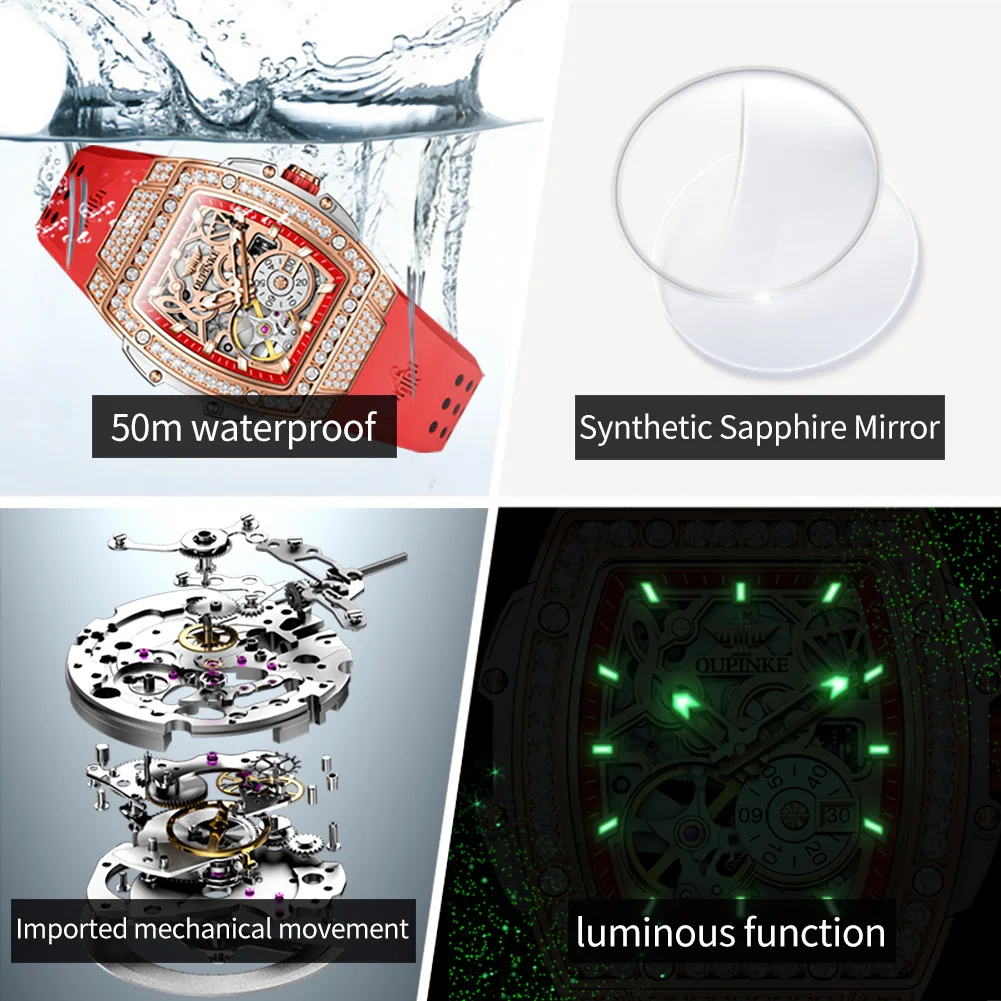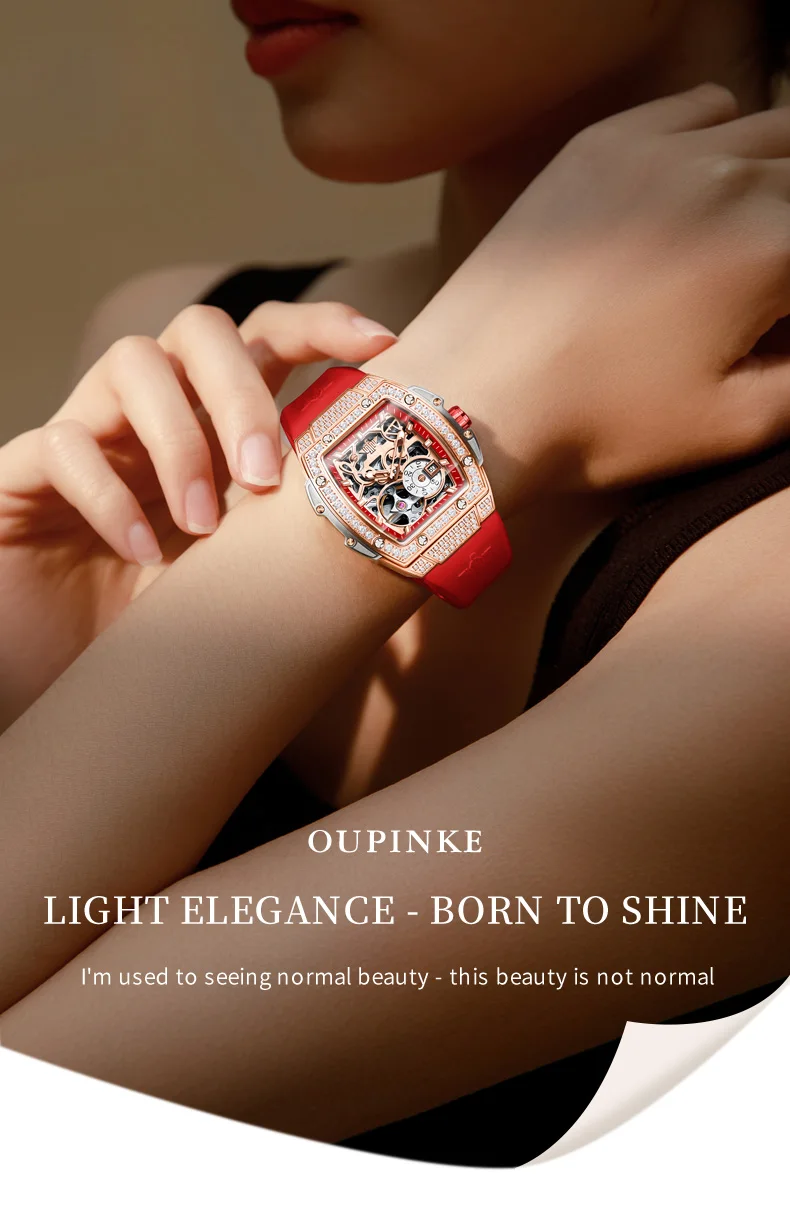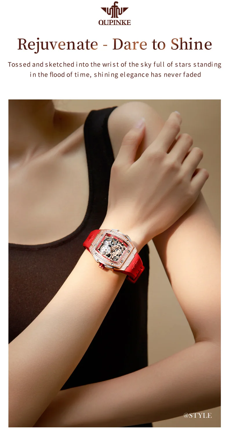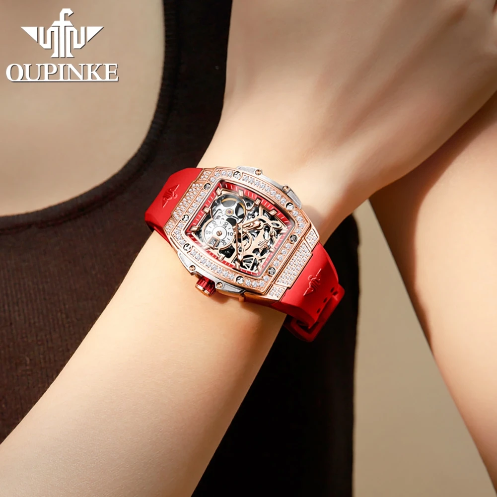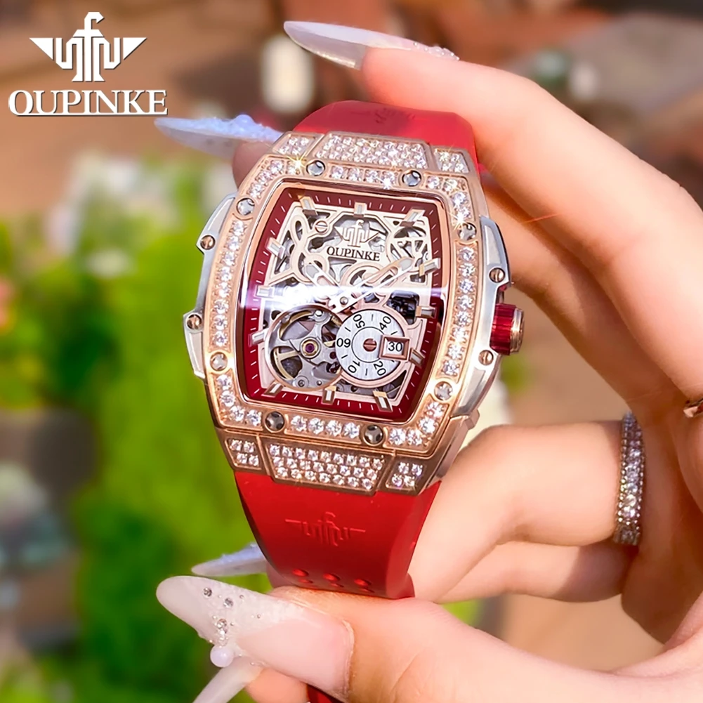 OUPINKE Ladies Automatic Watch Skeleton Mechanical Red Strap Fashion Diamond Crystal Evening Banquet Dress Watches for Women