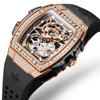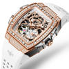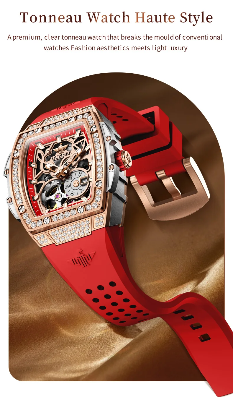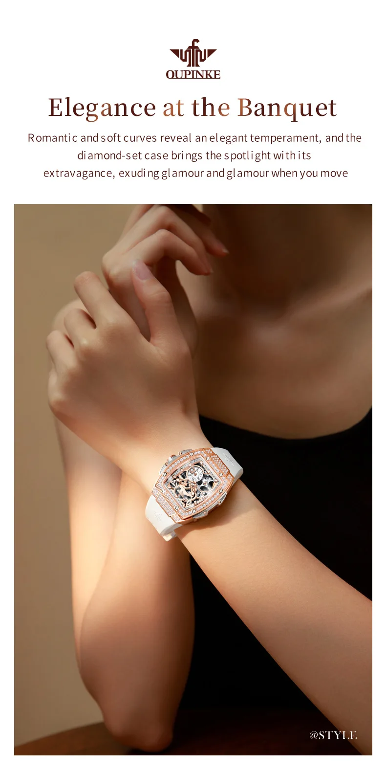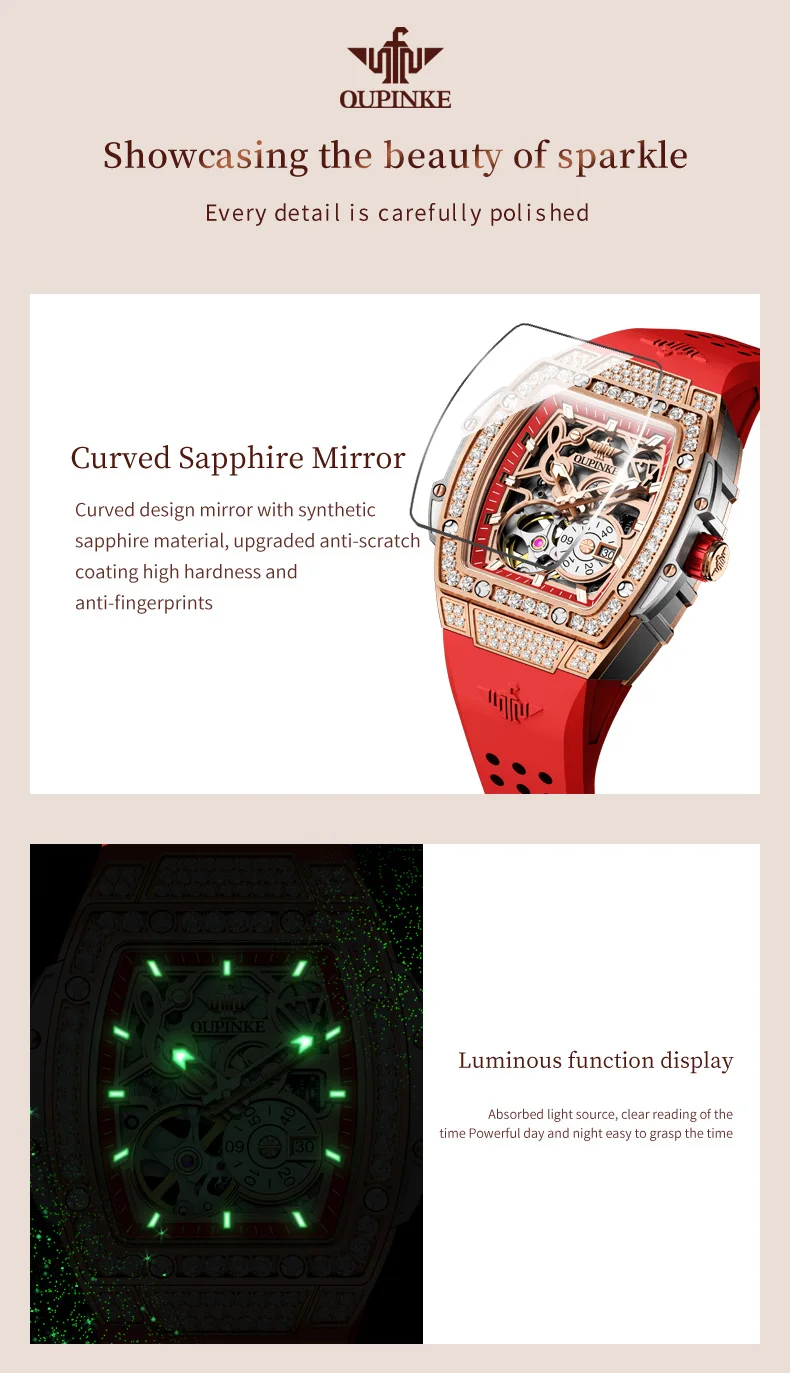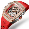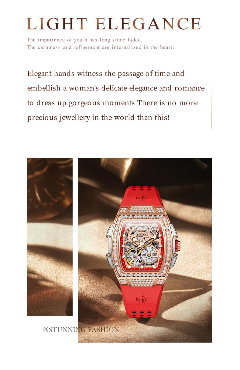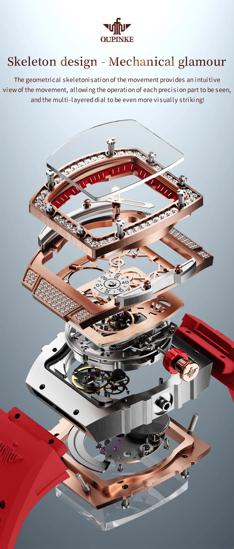 OUPINKE Ladies Automatic Watch Skeleton Mechanical Red Strap Fashion Diamond Crystal Evening Banquet Dress Watches for Women