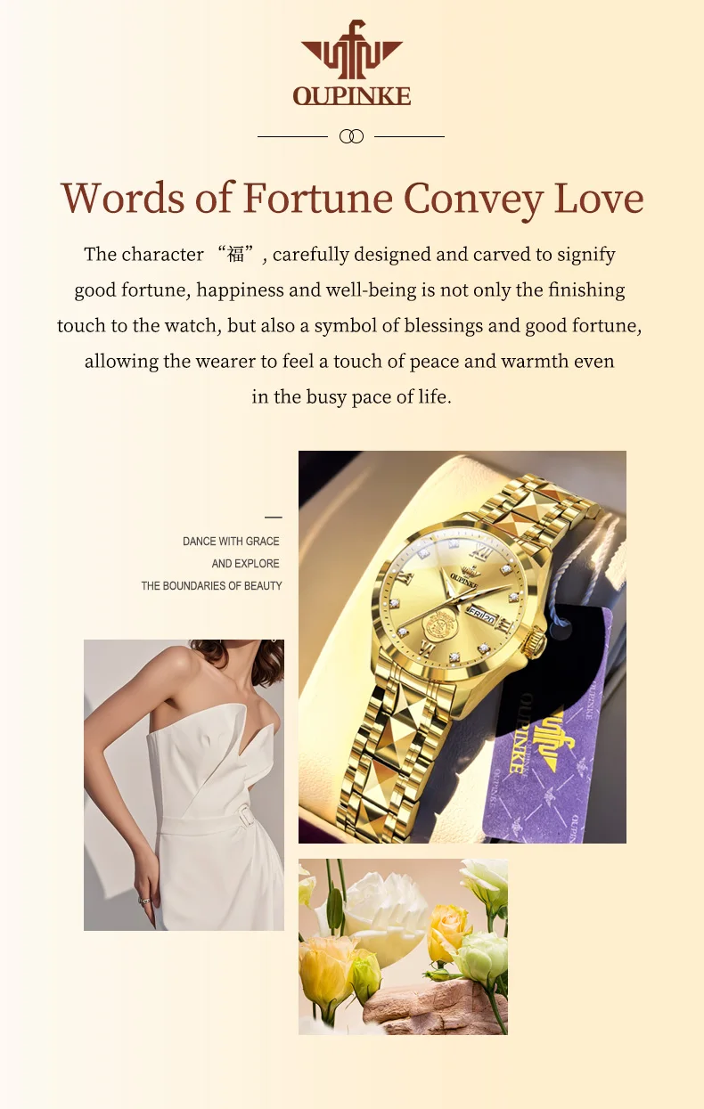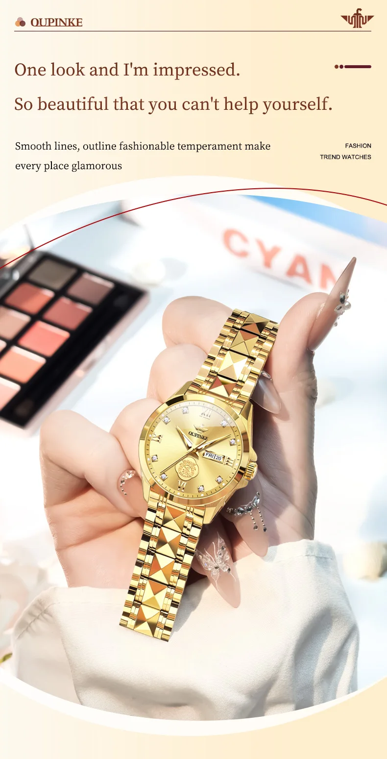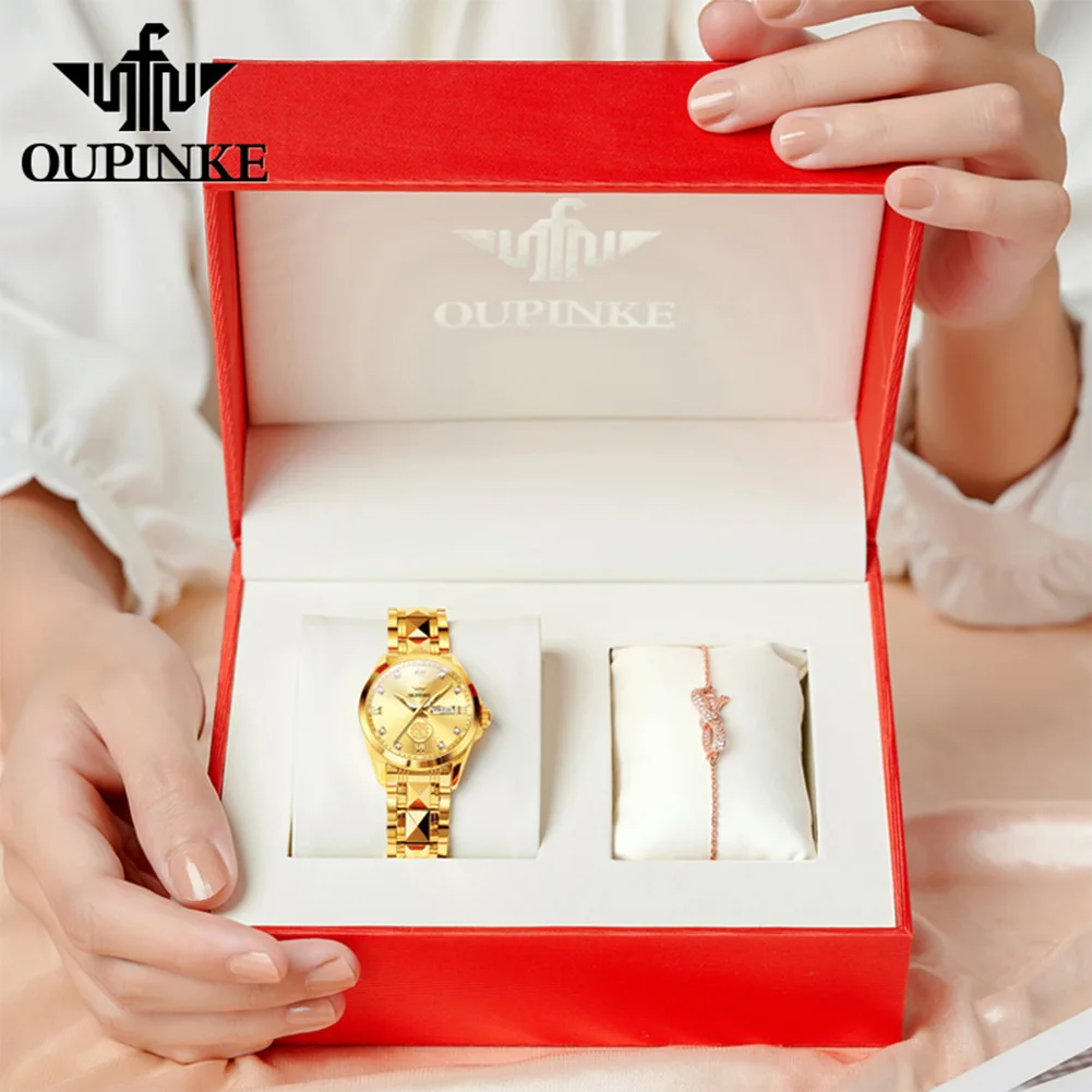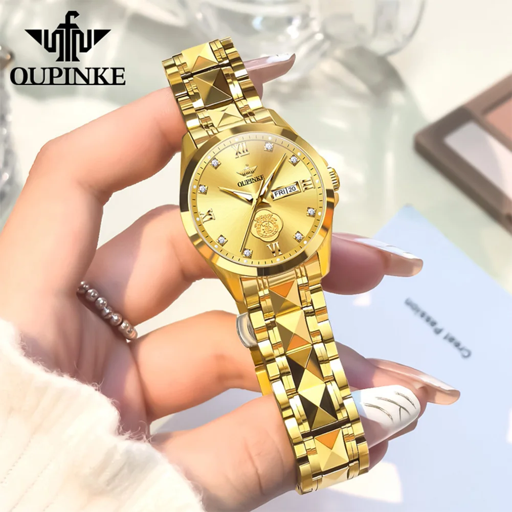 OUPINKE Real Diamond Real Gold Ladies Lucky Watches Luxury Brand Tungsten Steel Automatic Mechanical Wrist Watch for Women 3305
