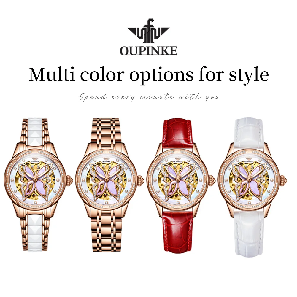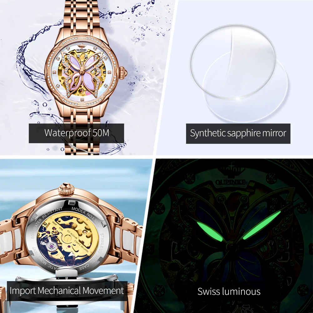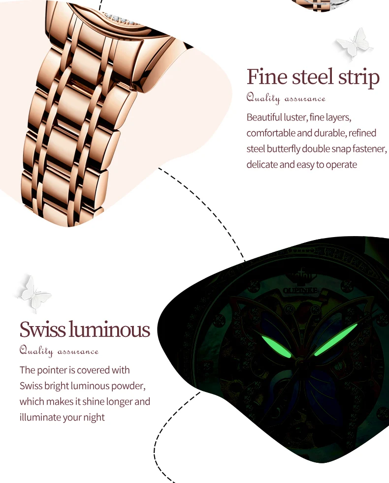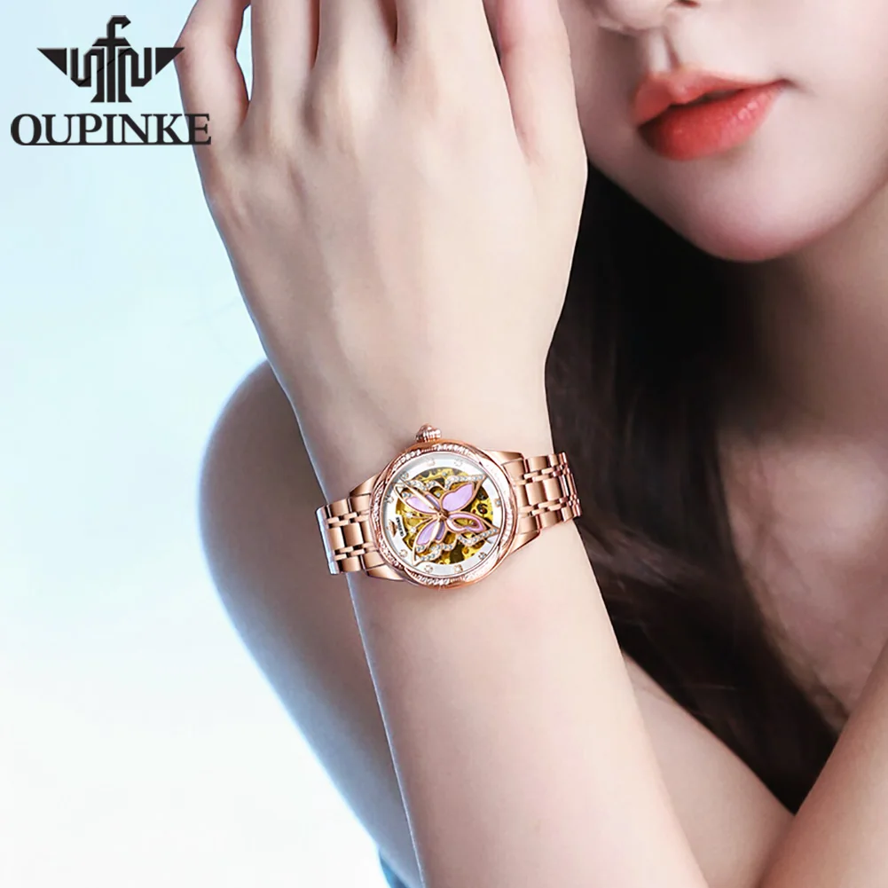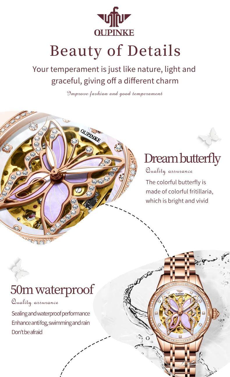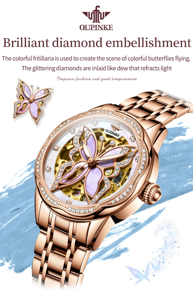 Featuring a unique butterfly dial, this OUPINKE watch exudes luxury and elegance, perfect for the fashion-conscious lady.