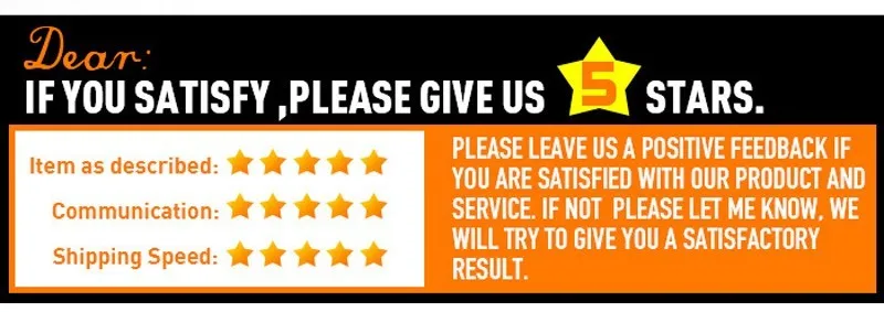 1. Feedback is very important to the Aliexpress buy experience. We believe you can enjoy good buyer experience with us. If you are satisfied with your purchase and our total service, please take a minute to leave us a positive feedback with an overall Detailed Selling Rating(DSR) of 5-Star.