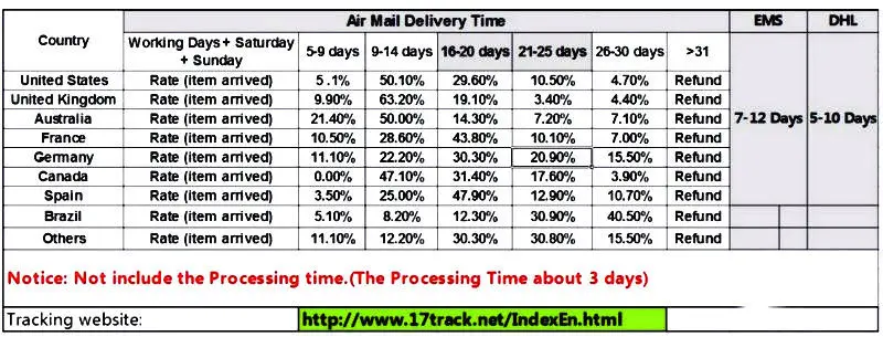 2. tems will be shipped by Hong Kong Air Mail or China Post Air Mail Service. Normally it will take you about 10-25 business days (exclude Saturday & Sunday, Public Holiday) to receive your items. Please contact us first if you don’t receive item for more than 30 days. Thanks for your understanding. 3. We also support fast shipment by “EMS” “DHL” “UPS” “TNT” “Fedex” (need additional cost).