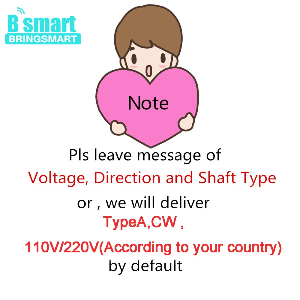 Please leave a message to tell us your choice ofvoltage,direction of rotation(CW / CCW;CW;CCWthree type) and the type of shaft (Type A;Type B;Type C;Type D)