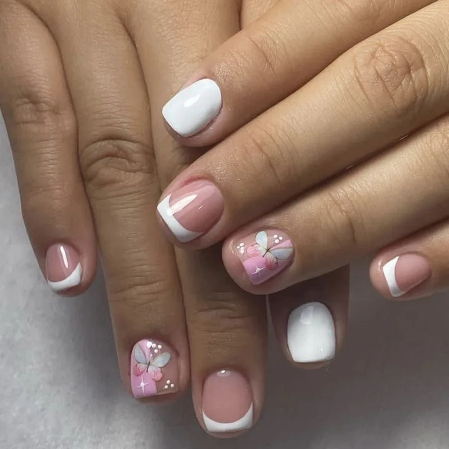 Pink French Style False Nails White Flower Printed Short Square Head Press on Nails Simple Wearable Artificial Nails Art 24Pcs