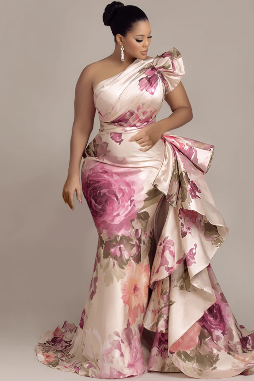 Plus Size Formal Pink Oblique Collar One Shoulder Ruffle Elegant Satin Maxi Dresses