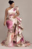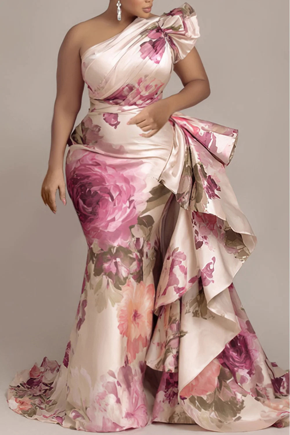 Plus Size Formal Pink Oblique Collar One Shoulder Ruffle Elegant Satin Maxi Dresses