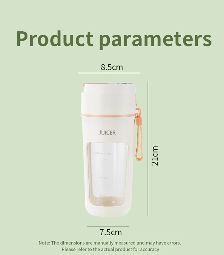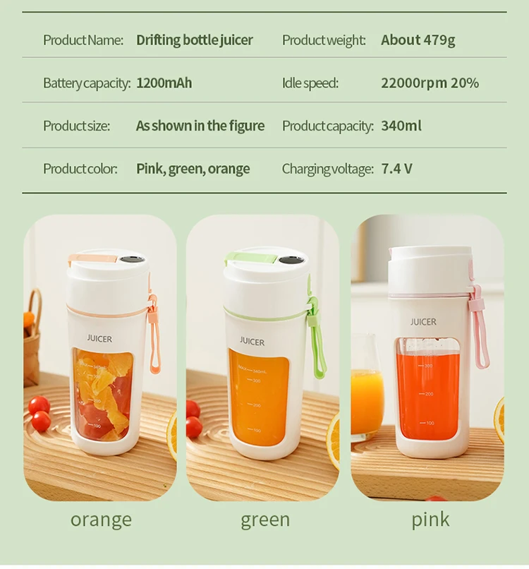 Product weight: 479g No-load speed: 22,000 RPM +-20% Product capacity :340ml Charging voltage :7.4V Product colors: pink, green, orange