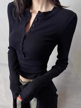 Polo Neck T Shirt for Women Sexy Crop Top Button Long Sleeve Woman Tshirt Slim Black Youthful Elegant Synthetic Aesthetic Luxury