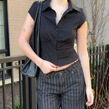 Summer Basic Black White Shirts Tops Women New Single Breasted Short Sleeved Slim Y2K Crop Tops