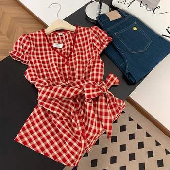 French Sweet Plaid Short Sleeve Shirt Women Summer Bow Tie Waist Slimming Cropped Top