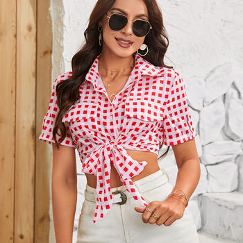 Y2K Cross Tie Crop Tops Women Summer New Plaid Slim Short Sleeve Lapel Shirts Female Vacation Style