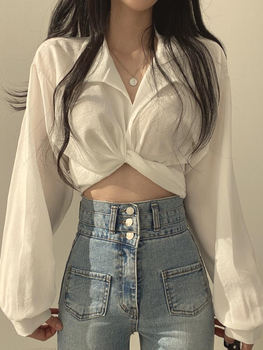 Lapel Bubble Sleeve Shirt Women Loose Fit Cropped Top