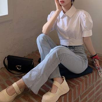 Korean Summer Puff sleeve White Shirt Cropped Women Elegant Youth Collar Blouses Clothes Preppy Short sleeve Cute Top