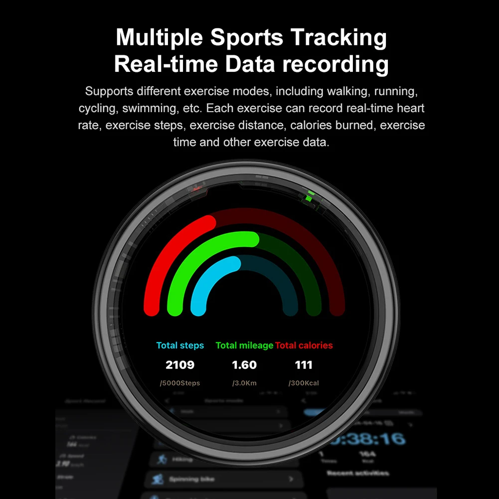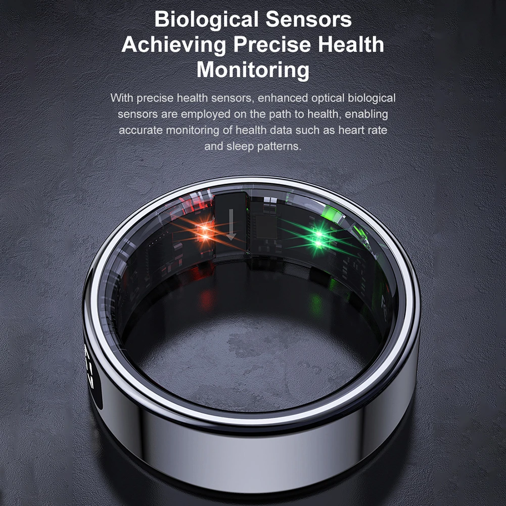 Feature: 1. Comprehensive Activity Tracking: The smart ring is your health manager, tracking daily activities like steps, distance, and calories. Stay on top of your fitness goals effortlessly with this heart rate blood oxygen monitor ring. 2. Advanced Health Monitoring: This health manager offers heart rate measurement, blood oxygen saturation, sleep tracking, multiple exercise modes, stress levels, and heart rate variability. Elevate your well-being with the fitness & sleep monitor. 3. Intuitive Touch Functionality: Easily switching display functions with a single touch on the smart ring. View time, steps, heart rate, battery level, and more, all at your fingertips with this versatile smartring. 4. Enhanced Display Features: The heart rate blood oxygen monitor ring displays time, steps, heart rate, battery status, and even counts blessings. Stay informed and motivated throughout your day with this fitness & sleep monitor. 5. Innovative Additional Features: Enjoy remote photo taking, find-your-ring functionality, gesture control, gaming, and female cycle tracking with the smartring. Plus, the QRing app supports numerous languages for a personalized experience. Specification: Origin: Mainland China Size: 8 (inner diameter 18.3mm), 9 (inner diameter 19.1mm), 10 (inner diameter 20mm), 11 (inner diameter 20.8mm), 12 (inner diameter 21.6mm), 13 (inner diameter 22.3mm) Thickness: 2.5mm Weight: 3.3g (No. 10) Chipset Supplier: Realtek Chipset: RTL8762 ESF APP: QRing Compatible System: for Android 5.1 (inclusive) and above, for IOS 8.0 (inclusive) and above FLASH memory: RAM 104KB FLASH 512KB BT: 5.2 low-power Bluetooth-Compatible chip Accelerometer: ST LIS2DOC Heart Rate: Vcare VC30F-S Battery type: polymer lithium ion Capacity: 15mAh (18mAh for No. 11 and above) Charging method: wireless charging Waterproof level: 5ATM Ring charging time: about 1.5 hours Life time: 5-7 days of use, 15 days of standby Appearance material: stainless steel Wireless charging stand Charging stand size: 47*16mm Color: black Charging interface: Type-c Material: plastic cover + zinc alloy bottom shell Packaging size: 103*80*32mm Gross weight: 103g Note: ![]()