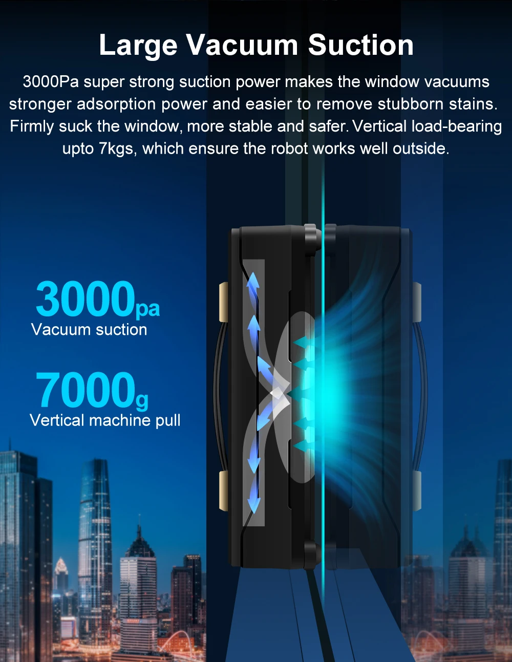 4 meters safety rope and the 650 mAh safety battery for optimal protection in the event of power failures. 40mins to keep the robot on window when low power.Vertical load-bearing up to 7kgs, which ensure the robot works well outside,
