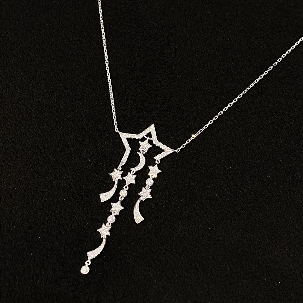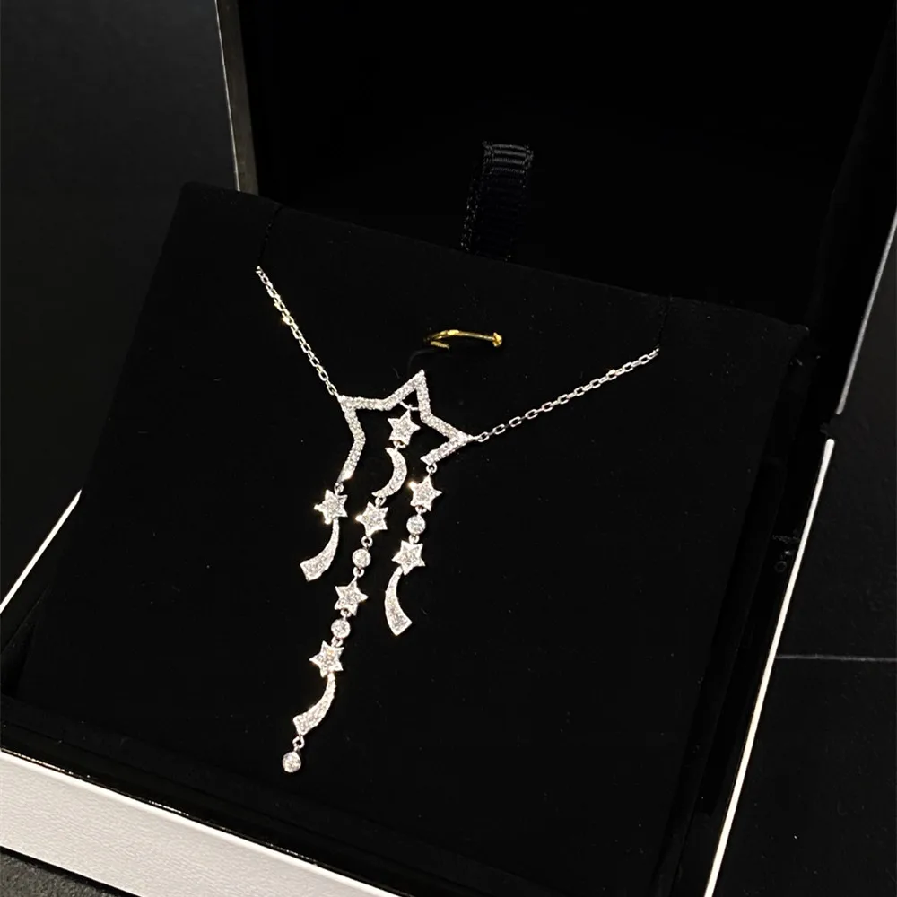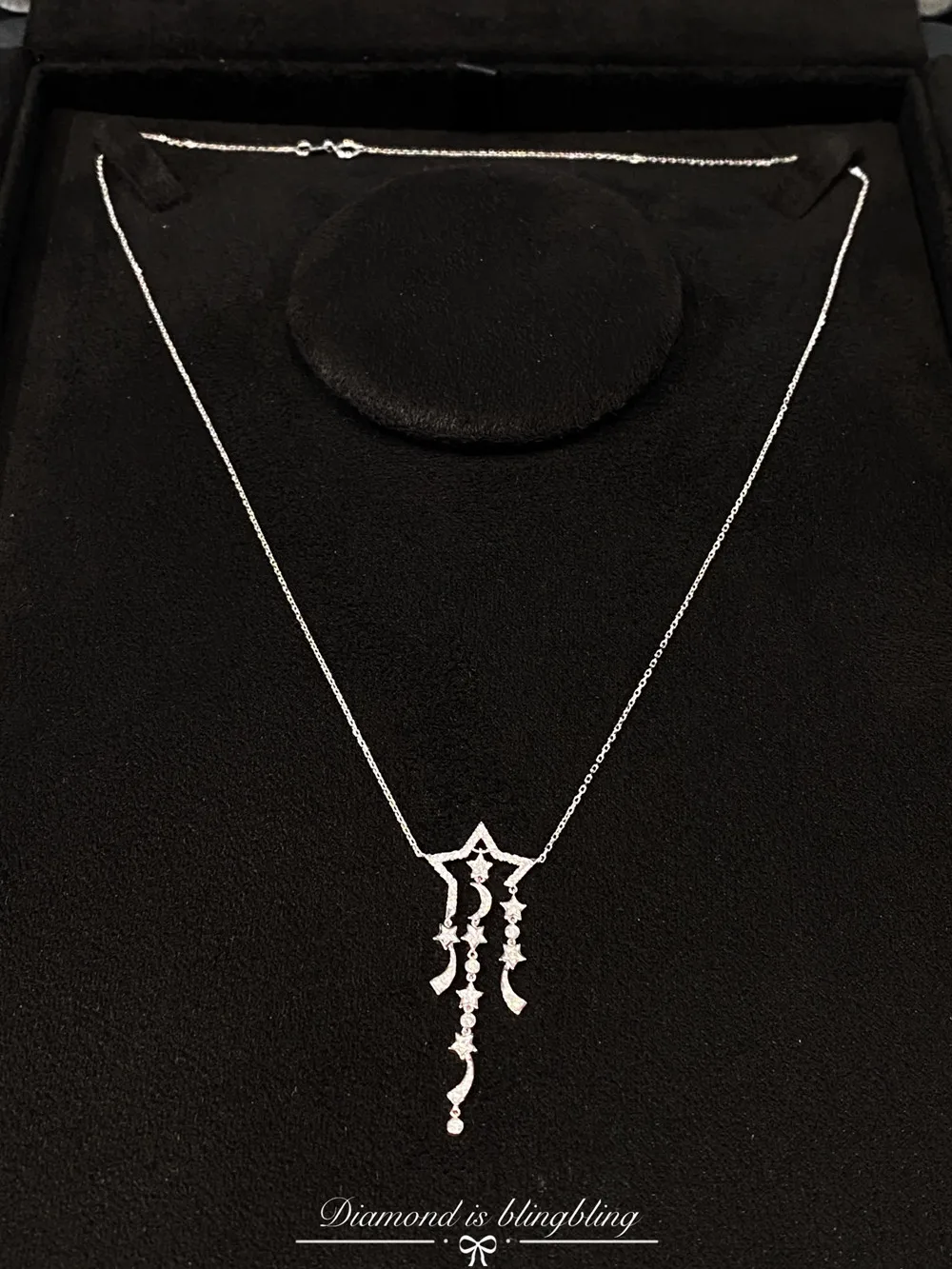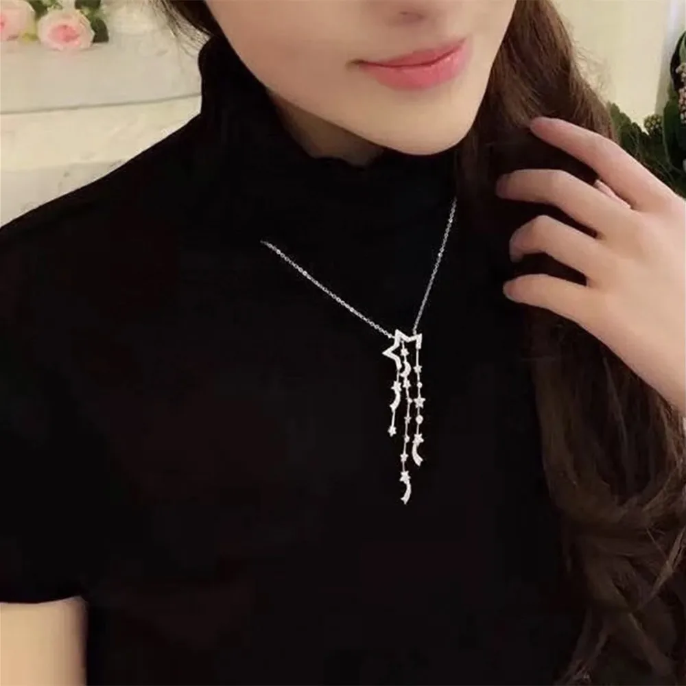 Shelly Romantic Real 18K Solid White Gold AU750 Jewelry Natural Diamonds Star Moon Tassles Pendant Necklaces for Women Girl Gift