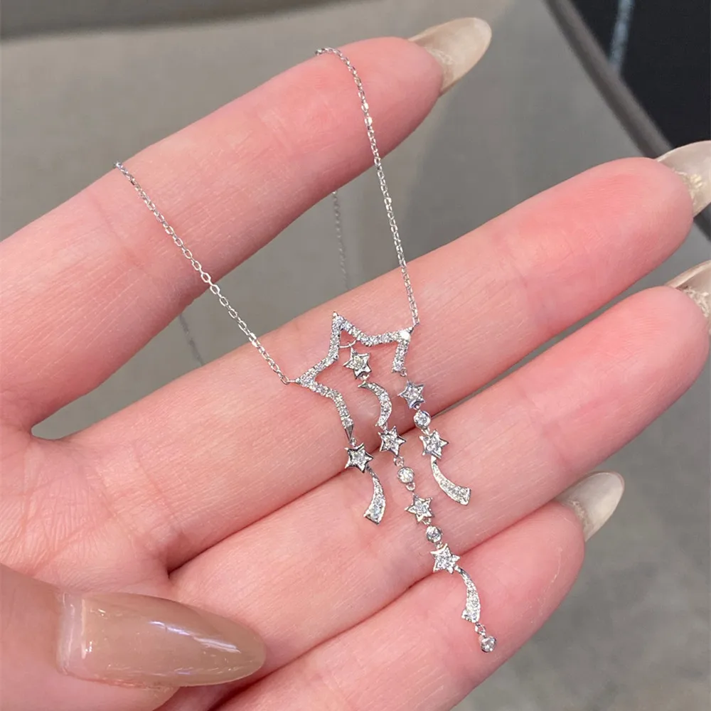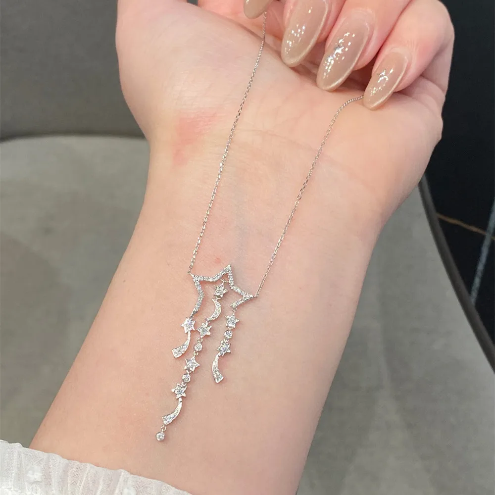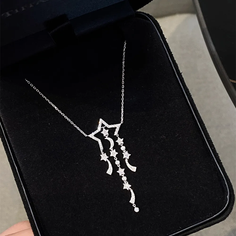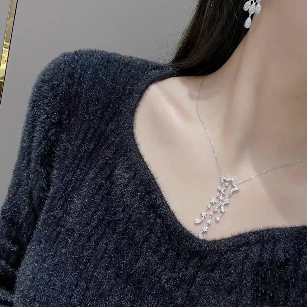 Shelly Romantic Real 18K Solid White Gold AU750 Jewelry Natural Diamonds Star Moon Tassles Pendant Necklaces for Women Girl Gift