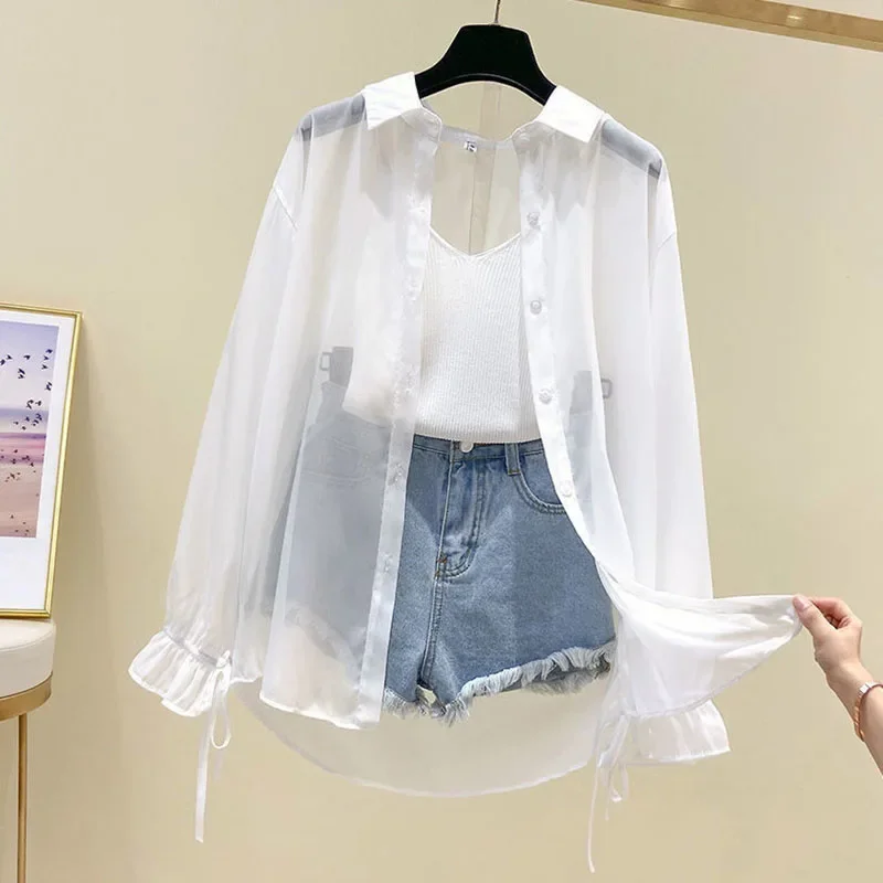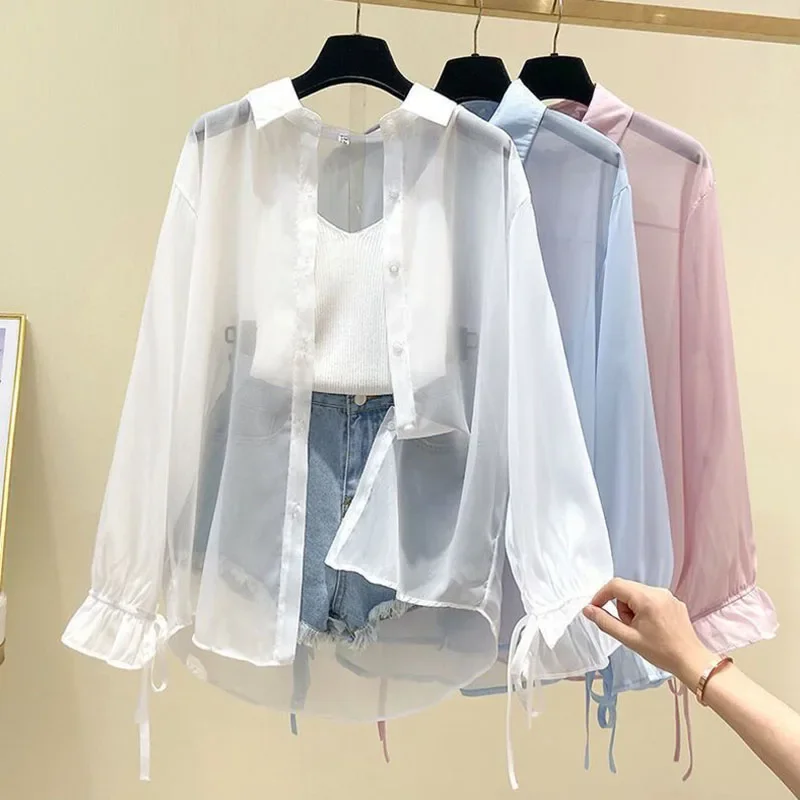 Smvp Chiffon Blouses for Women Summer Thin Loose Button-Up Sunscreen Shirt Woman Korean Fashion Bow Lace-up Long Sleeve Shirts
