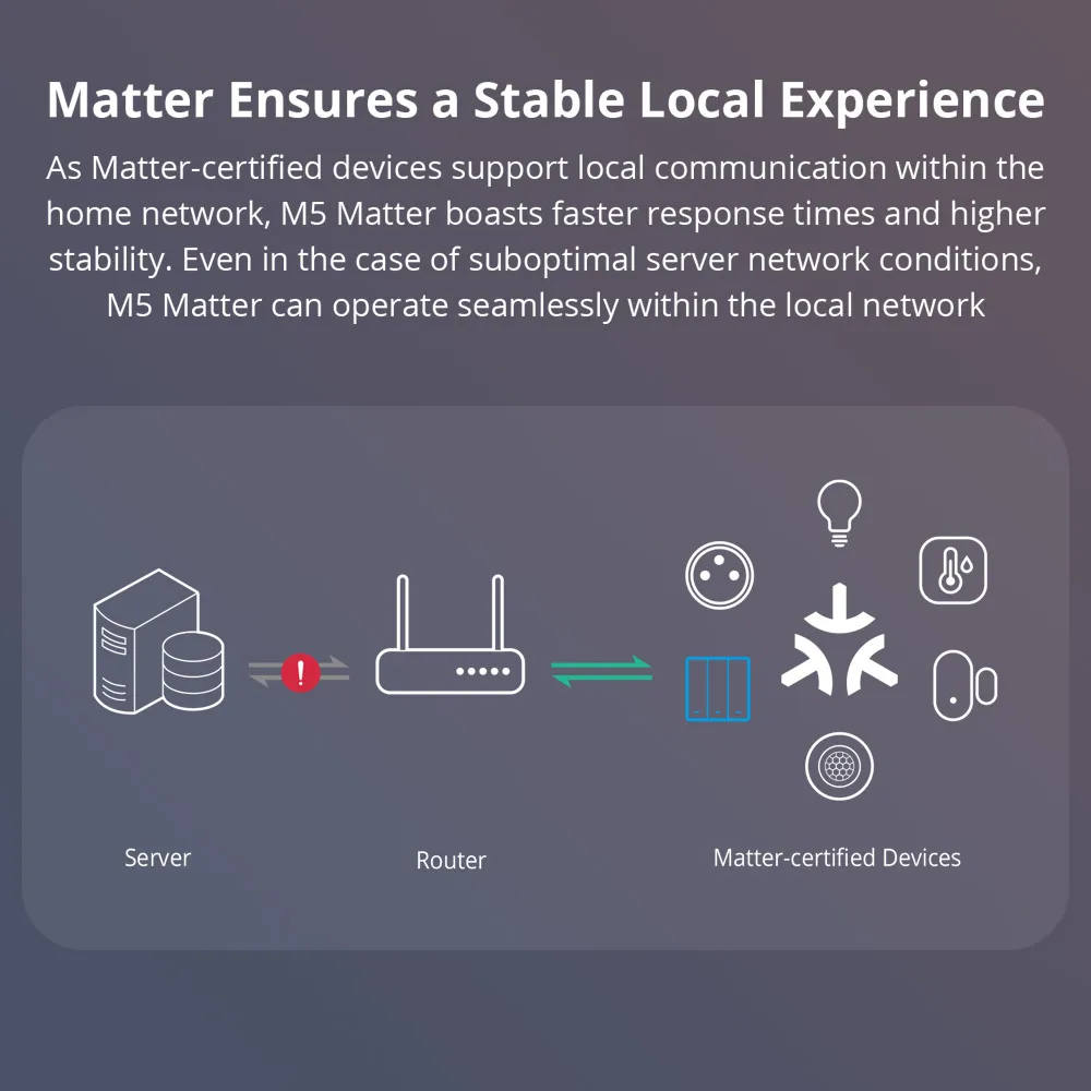 Certified by Matter, M5 Matter seamlessly integrates into Matter-enabled ecosystems like Alexa, Google Home, and Apple Home, and partners with other brand’s devices to create your smart life. As Matter-certified devices support local communication within the home network, M5 Matter boasts faster response times and higher stability. Even in the case of suboptimal server network conditions, M5 Matter can operate seamlessly within the local network. Supports work with the Apple ecosystem through Matter to control M5 Matter in the Apple Home App and create automation with devices from different manufacturers.