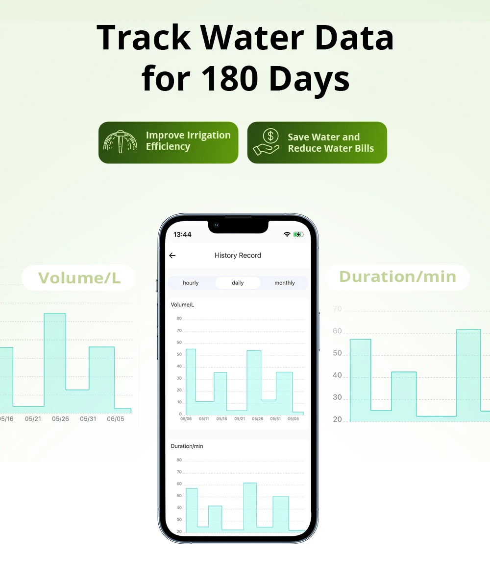 Support checking up to 180 days of water usage and duration through the app. Understand daily, weekly, or monthly data to better control irrigation amounts and save more on water bills.