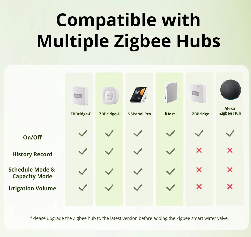 SONOFF Zigbee Smart Water Valve is compatible with Zigbee hubs supporting Zigbee 3.0, including SONOFF iHost, SONOFF NSPanel Pro, ZB Bridge Pro, ZBDongle-P, ZBDongle-E, Echo Plus 2nd…
