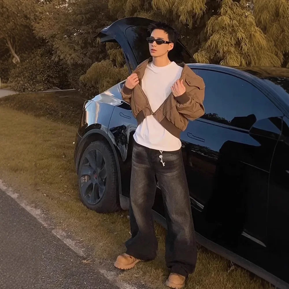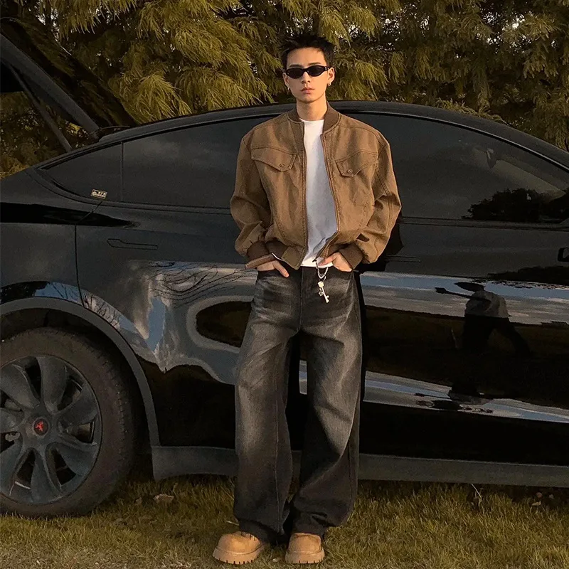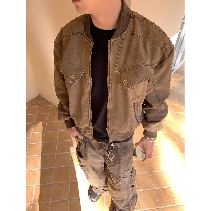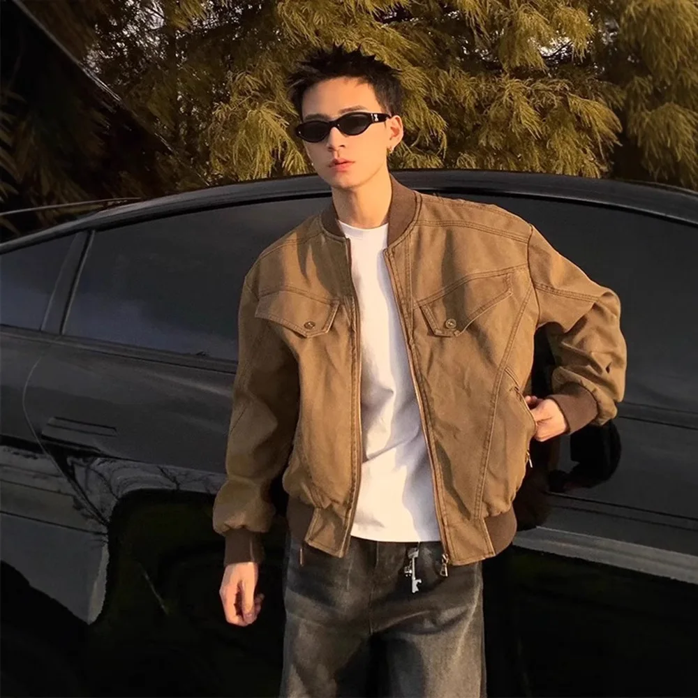Spring Autumn Men’s Casual Trendy Solid Color Zipper Baseball Jacket New Fashion American Brown Black Bomber Jacket Male Tops