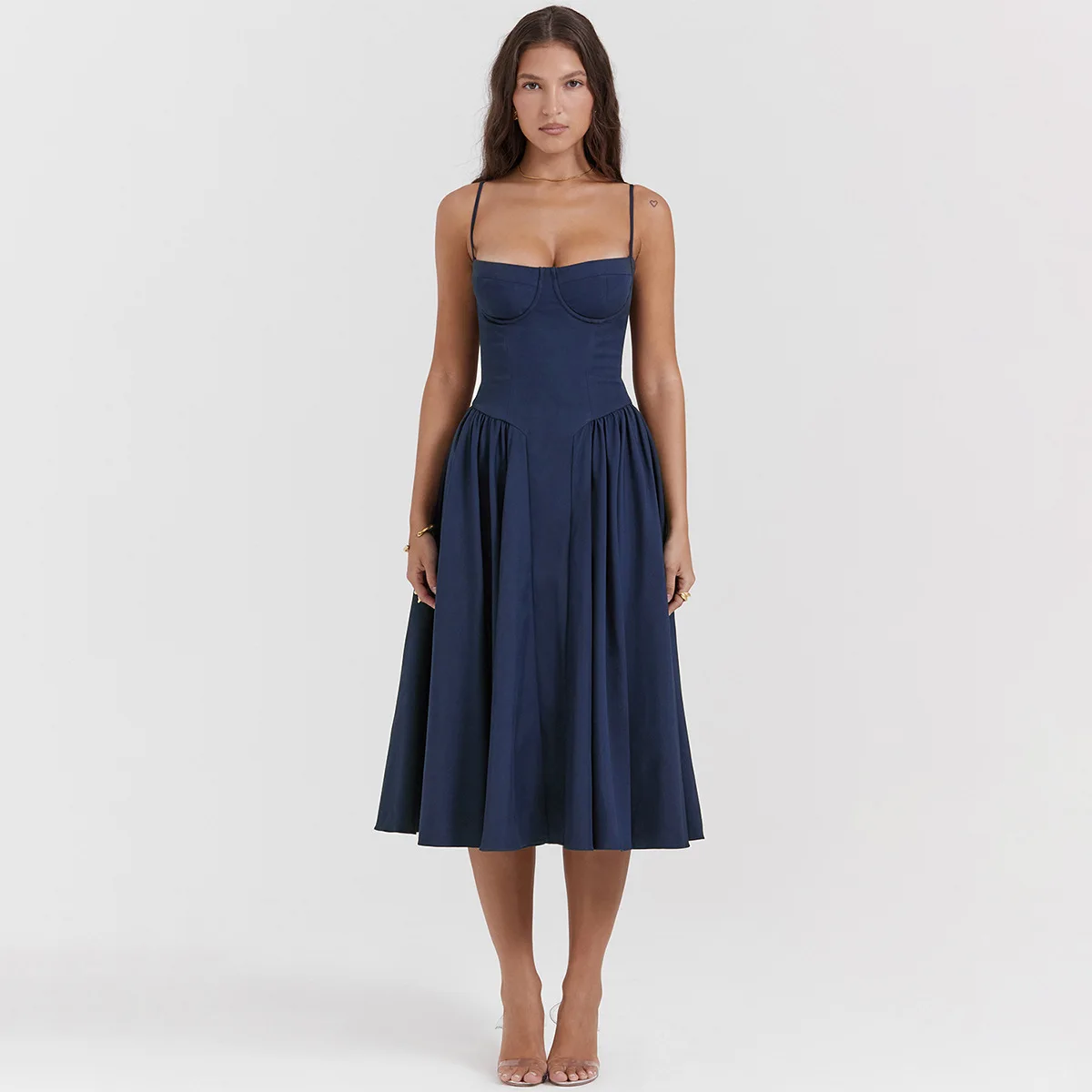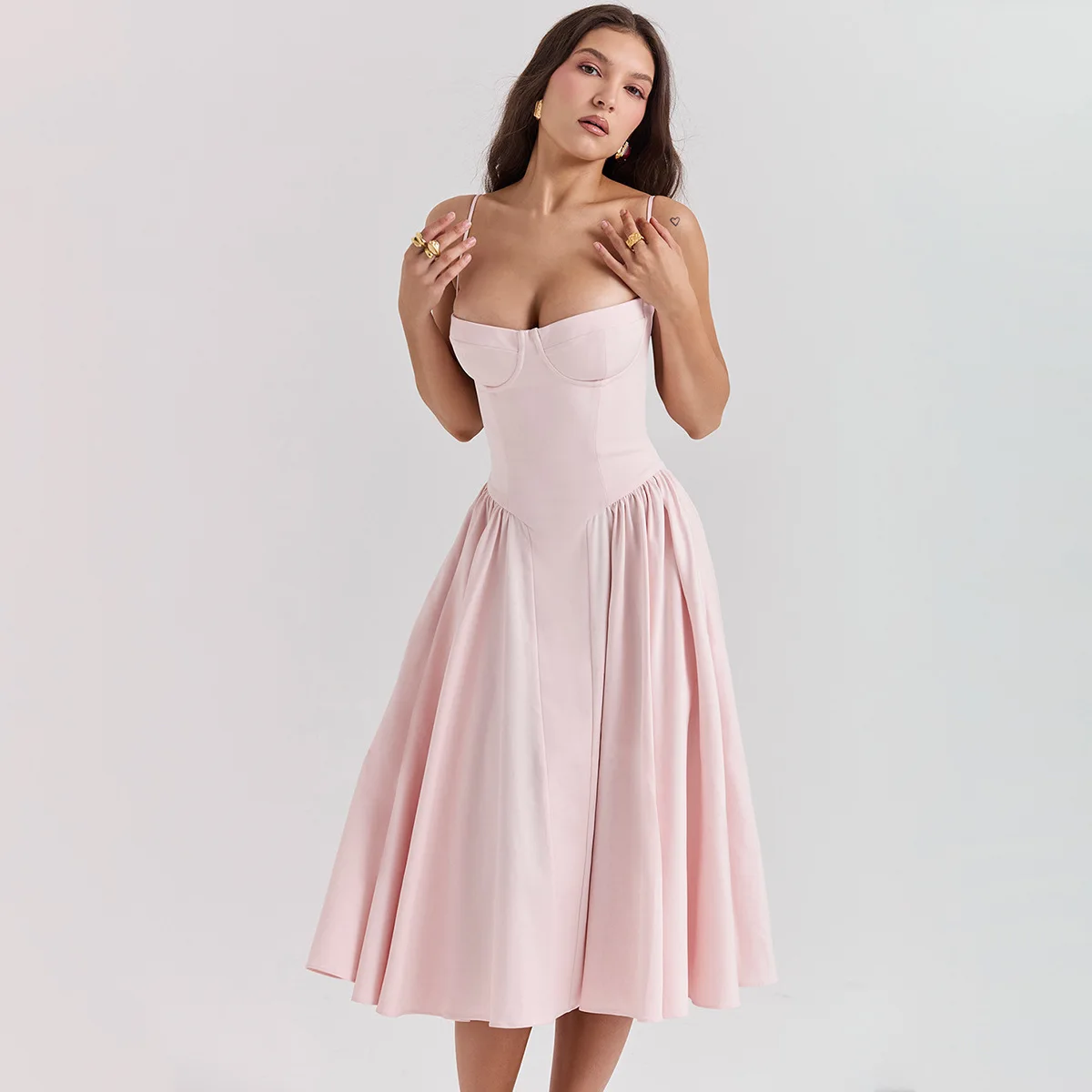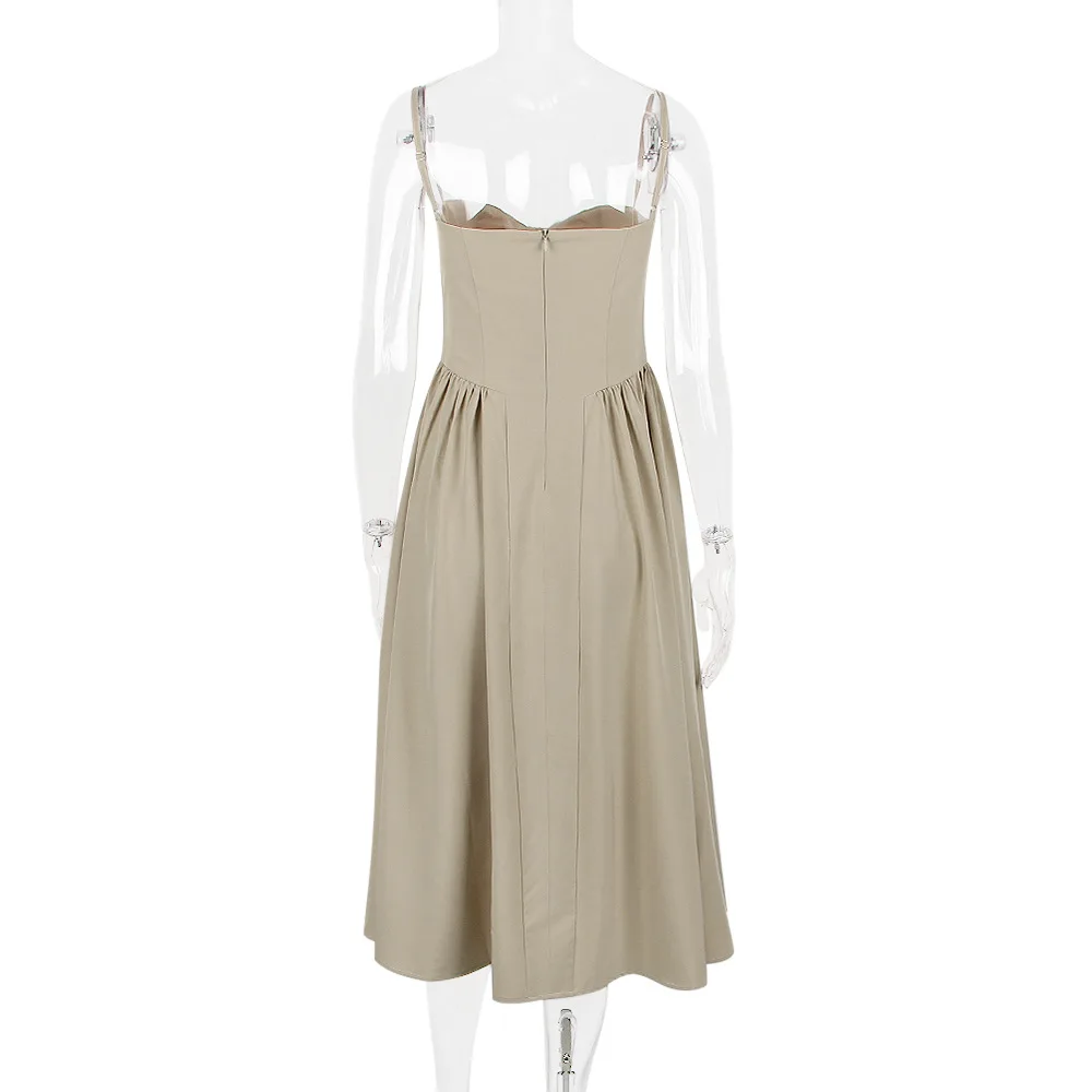 Summer Women Elegant Sleeveless Backless Pleated Dresses Lady Sexy Solid Sling Midi Dress 2024 Female Party Evening A-line Robes
