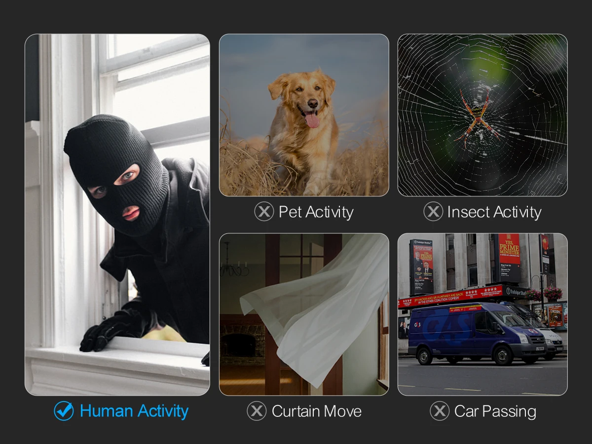 Smart Ai Detection function , Monitor moving objects, automatically illuminate. support mixing line, area, two-way flow detection, for human form, easy setting in App.