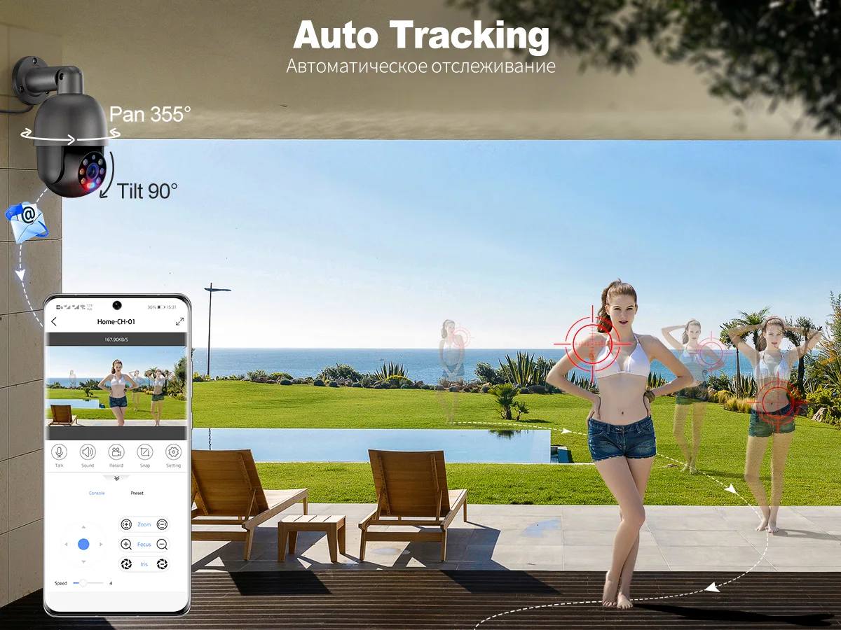 6. Human Auto Tracking and Daemon Position Setting: When human detected, the camera will auto track the moving huamn and auto rotate to the daemon position you set